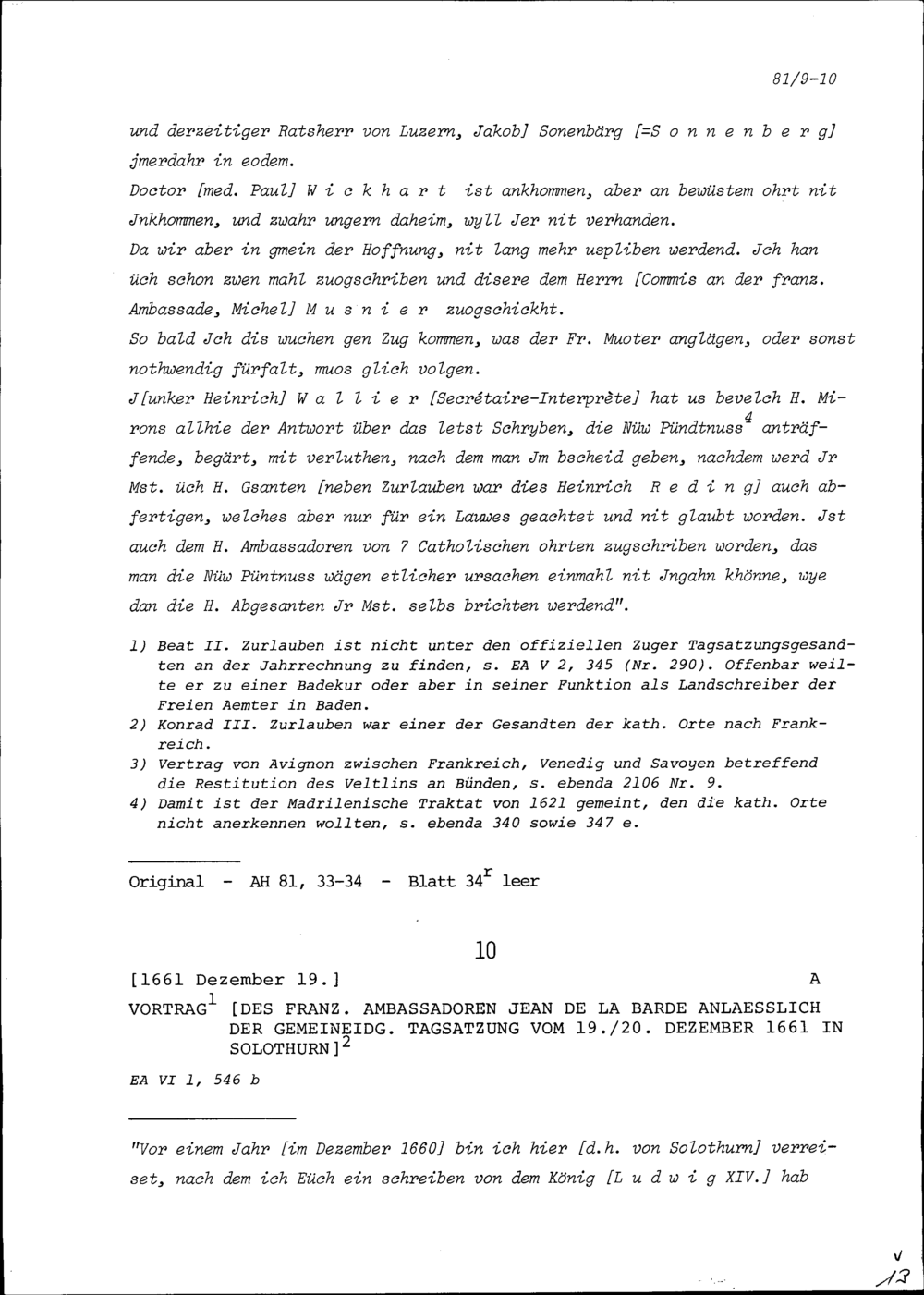 Vortrag von Jean de la Barde, Ambassador von Frankreich, anlässlich der Tagsatzung vom 19. und 20. Dezember 1661 in Solothurn