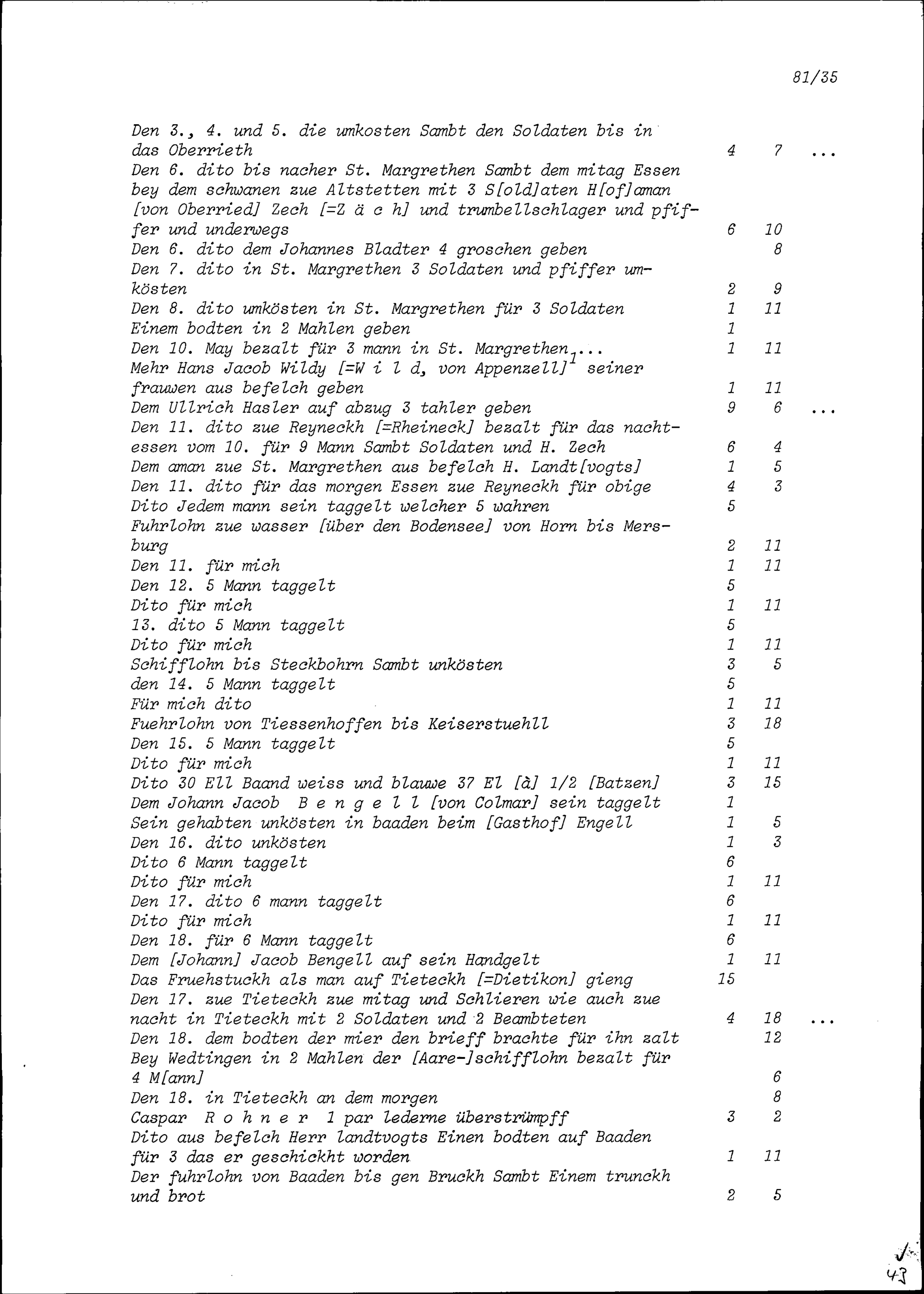 Abrechnung eines ungenannten Werbers für im Rheintal unter Fidel Zurlauben, Landvogt, für die Gardekompanie von Beat Franz Plazidus Zurlauben in Frankreich vorgenommene Werbungen