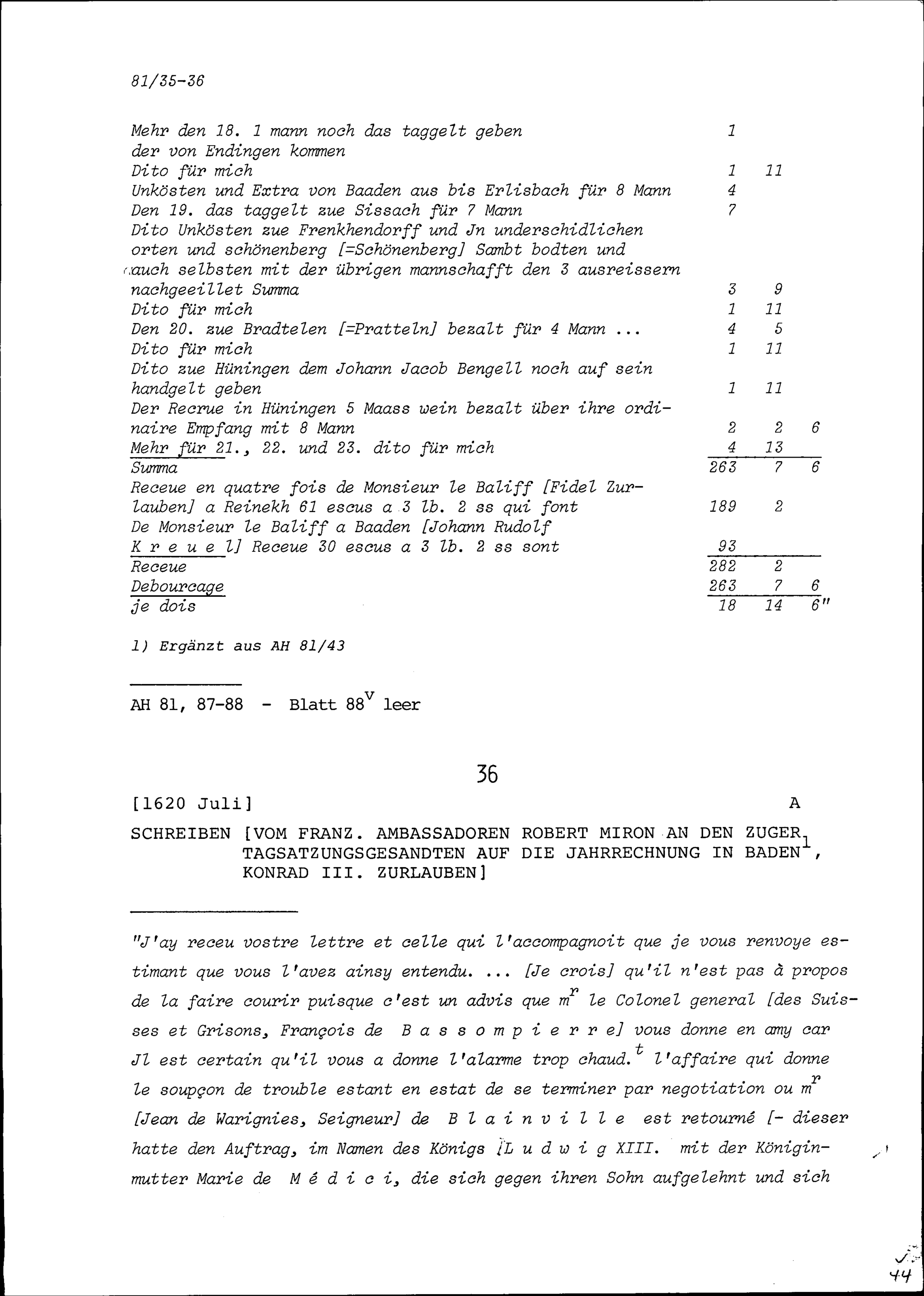 Schreiben von Robert Miron, Ambassador von Frankreich, an Konrad III. Zurlauben, Zuger Tagsatzungsgesandter in Baden
