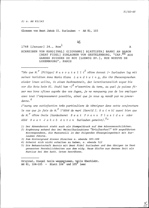 Schreiben von Giovanni Battista Barni, Kardinal, an Beat Fidel Zurlauben, Paris