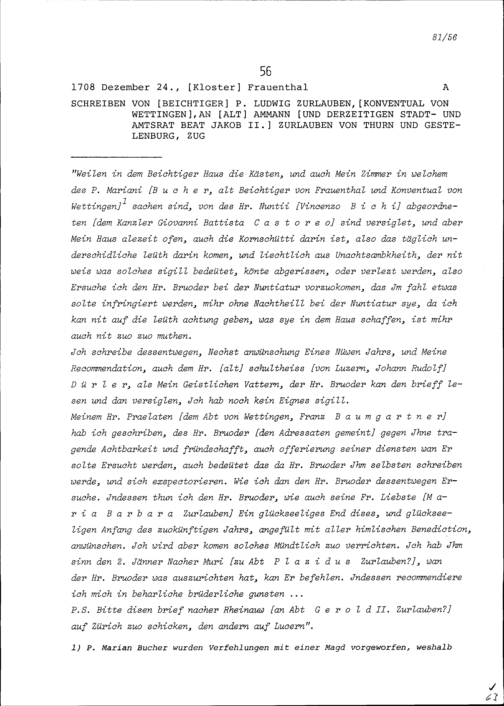 Schreiben von Ludwig Zurlauben, Konventuale von Wettingen und Beichtiger, an Beat...