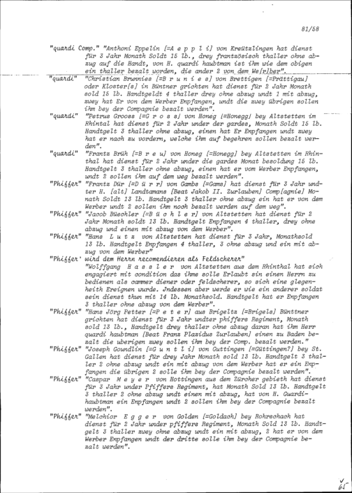 Verzeichnis der Rekruten, welche von Balthasar Meyer, von Hägglingen in der Grafschaft Baden und im Rheintal für die Gardekompanie von Beat Franz Plazidus Zurlauben beziehungsweise die Kompanie von Beat Jakob II. Zurlauben im Regiment Pfyffer geworben worden