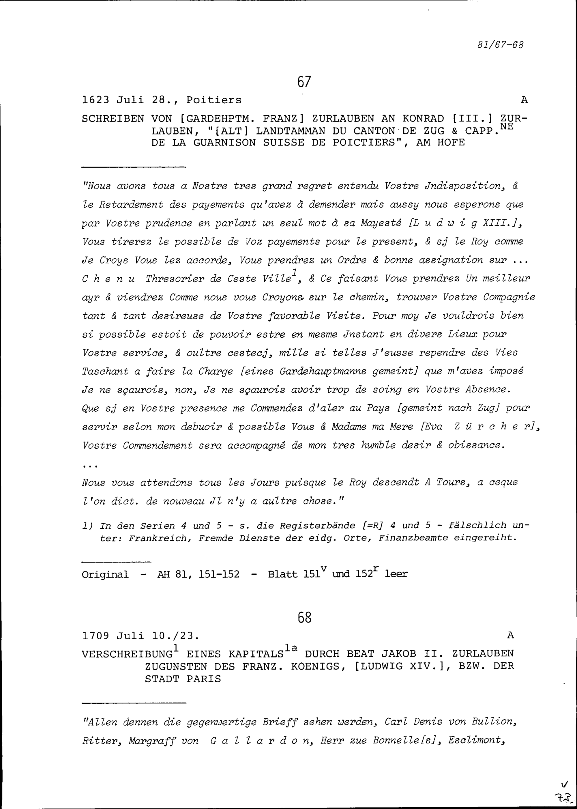 Schreiben von Franz Zurlauben, Gardehauptmann, an Konrad III. Zurlauben, Altlandammann, am Hof in Paris