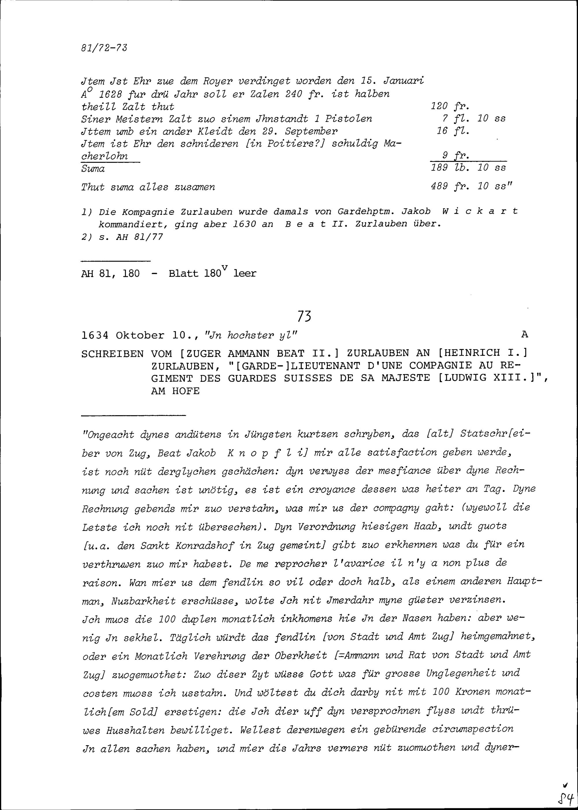 Schreiben von Beat II. Zurlauben, Ammann Zug, an Heinrich I. Zurlauben, am Hof in Paris