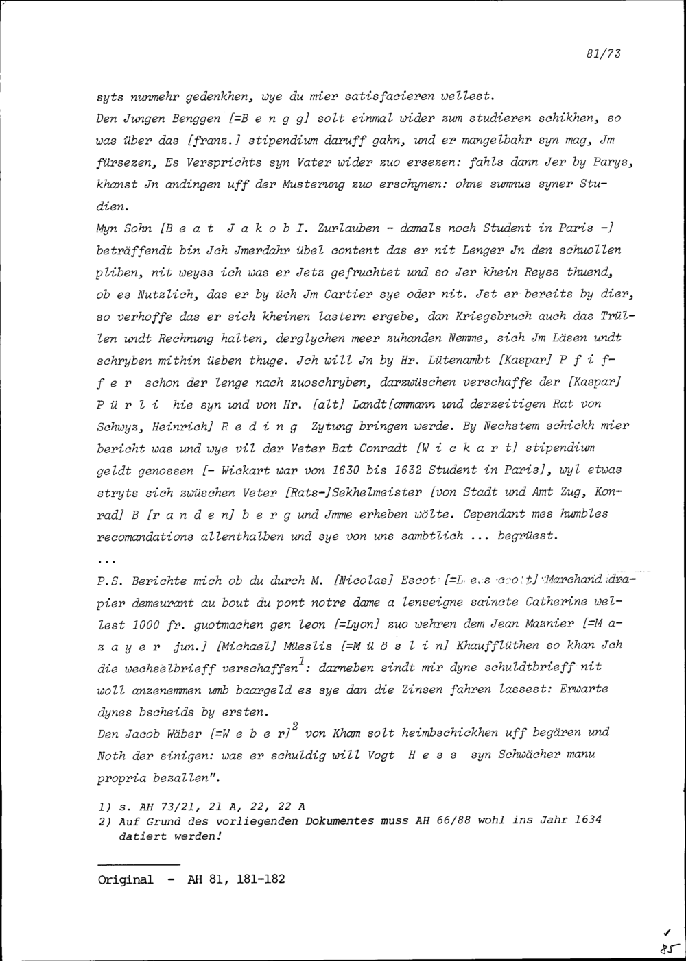 Schreiben von Beat II. Zurlauben, Ammann Zug, an Heinrich I. Zurlauben, am Hof in Paris