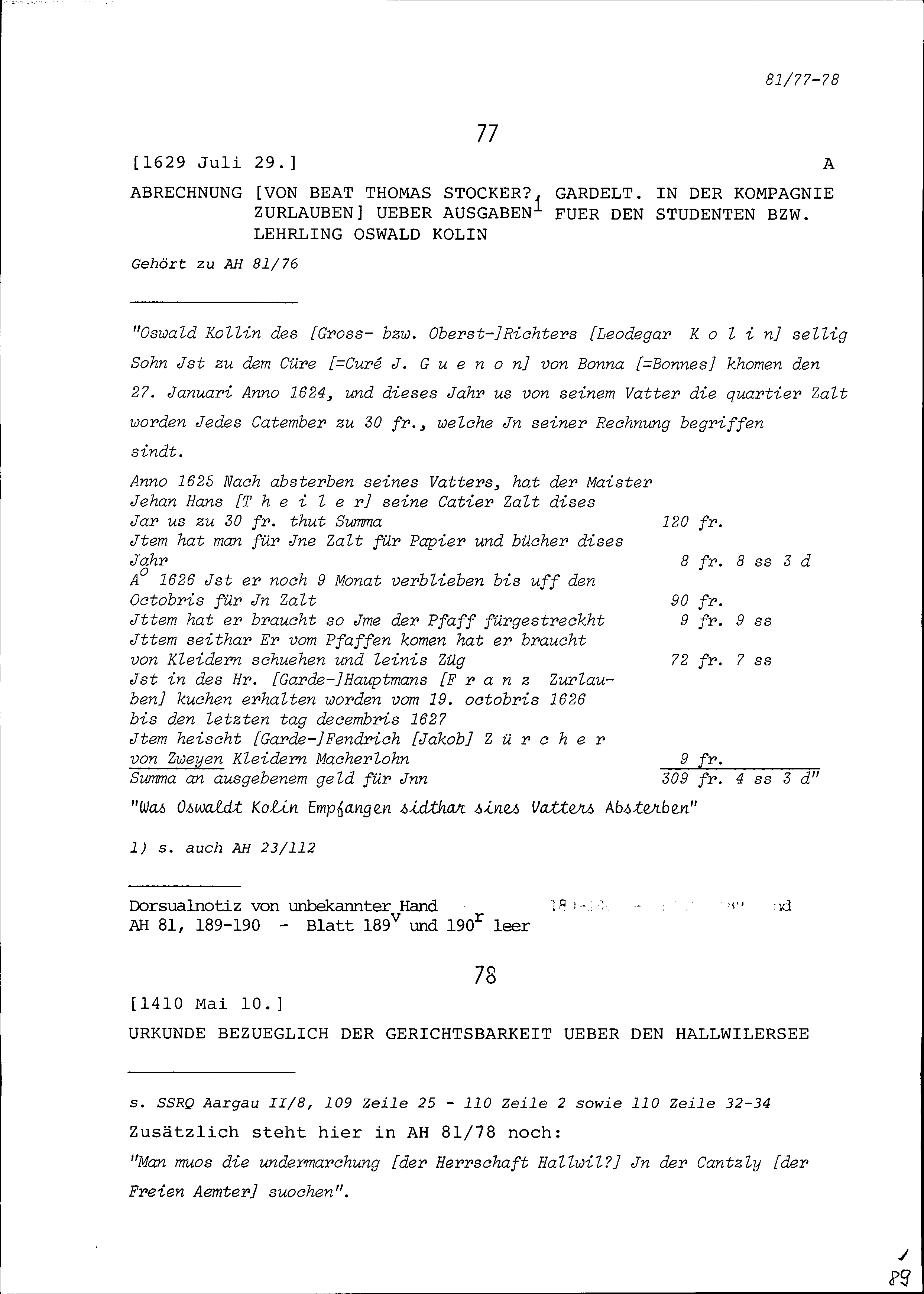 Abrechnung von Beat Thomas Stocker, Gardeleutnant in der Kompanie Zurlauben, über Ausgaben für Oswald Kolin, Student beziehungsweise Lehrling