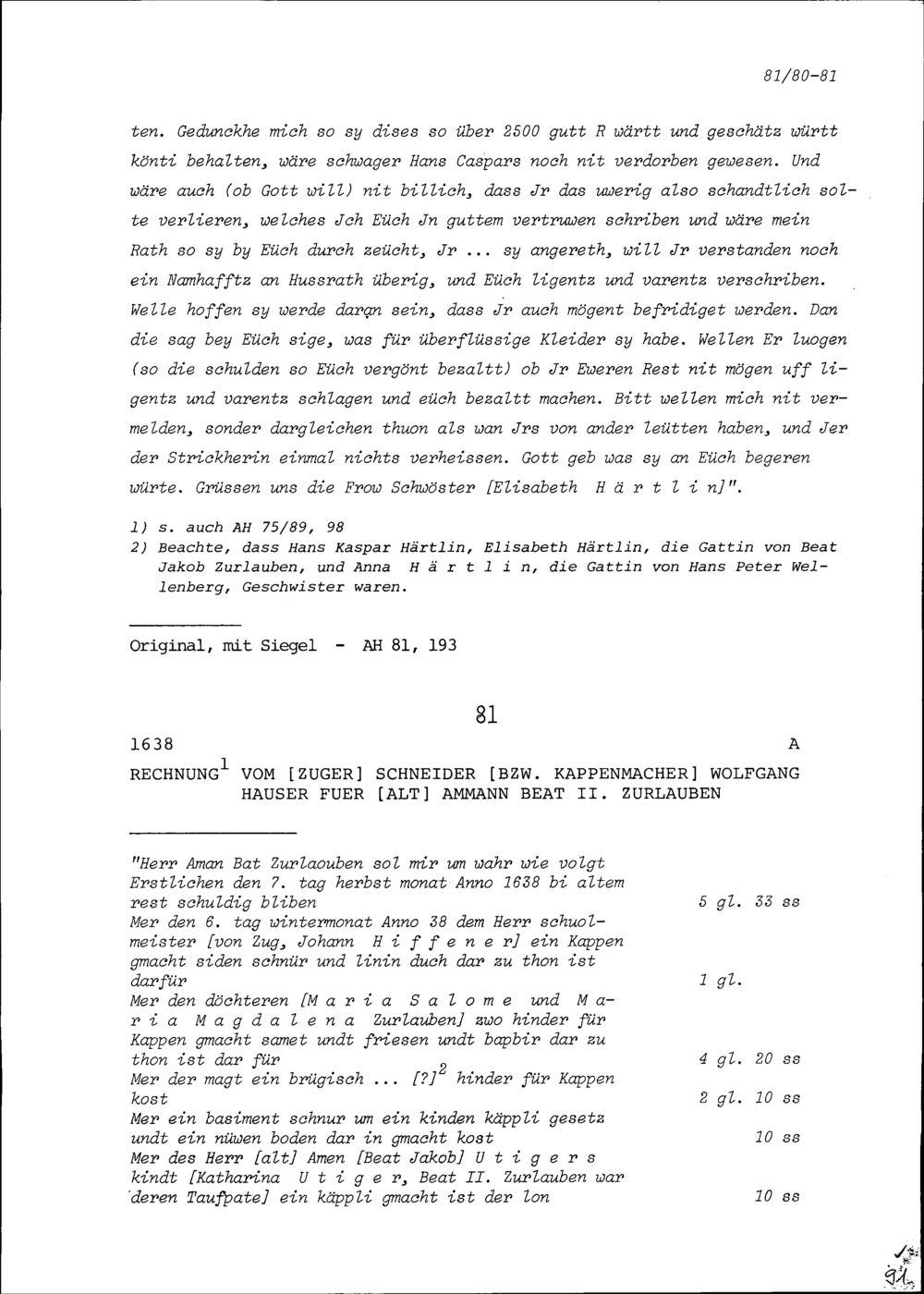 Rechnung von Wolfgang Hauser, Zuger Schneider beziehungsweise Kappenmacher, für Beat II. Zurlauben, Altammann