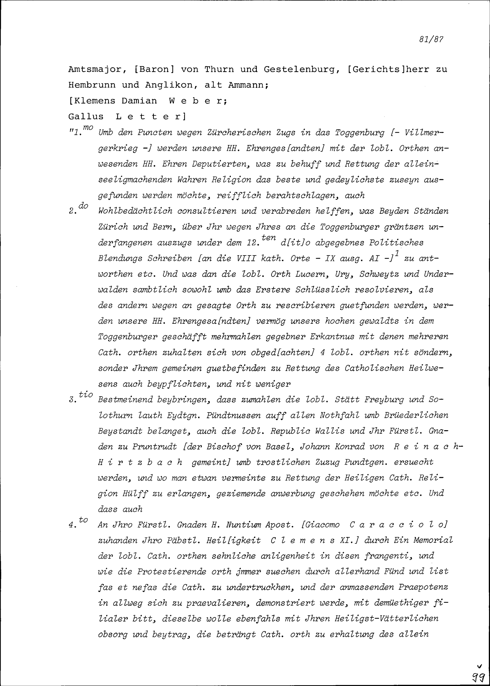 Instruktion von Stadt und Amt Zug auf die Tagsatzung der Fünf Katholischen Orte vom 15. bis 17. April 1712 in Brunnen