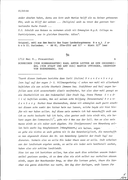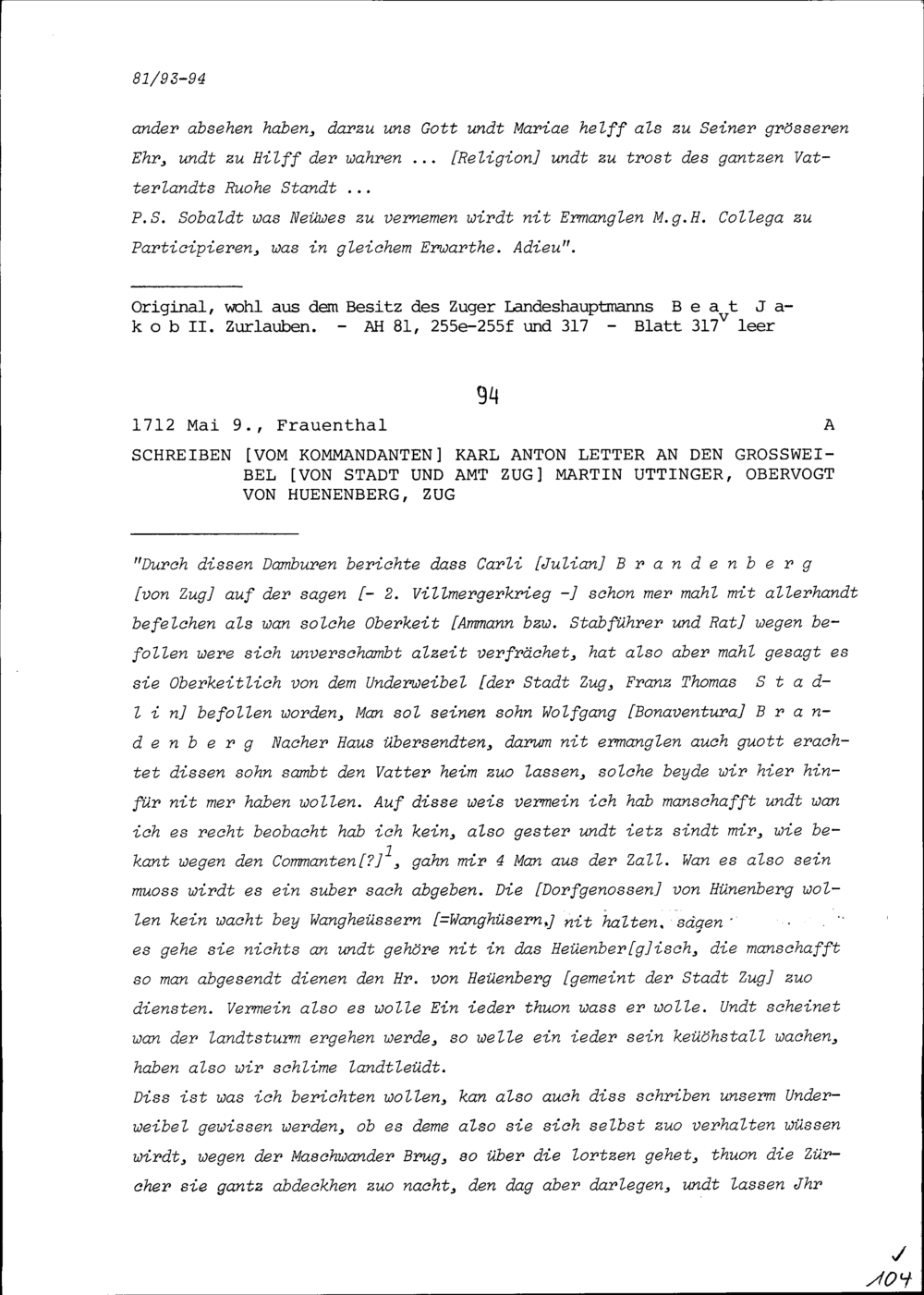 Schreiben von Karl Anton Letter, Kommandant von Frauenthal, an Martin Uttinger, Grossweibel von Stadt und Amt Zug und Obervogt von Hünenberg, Zug