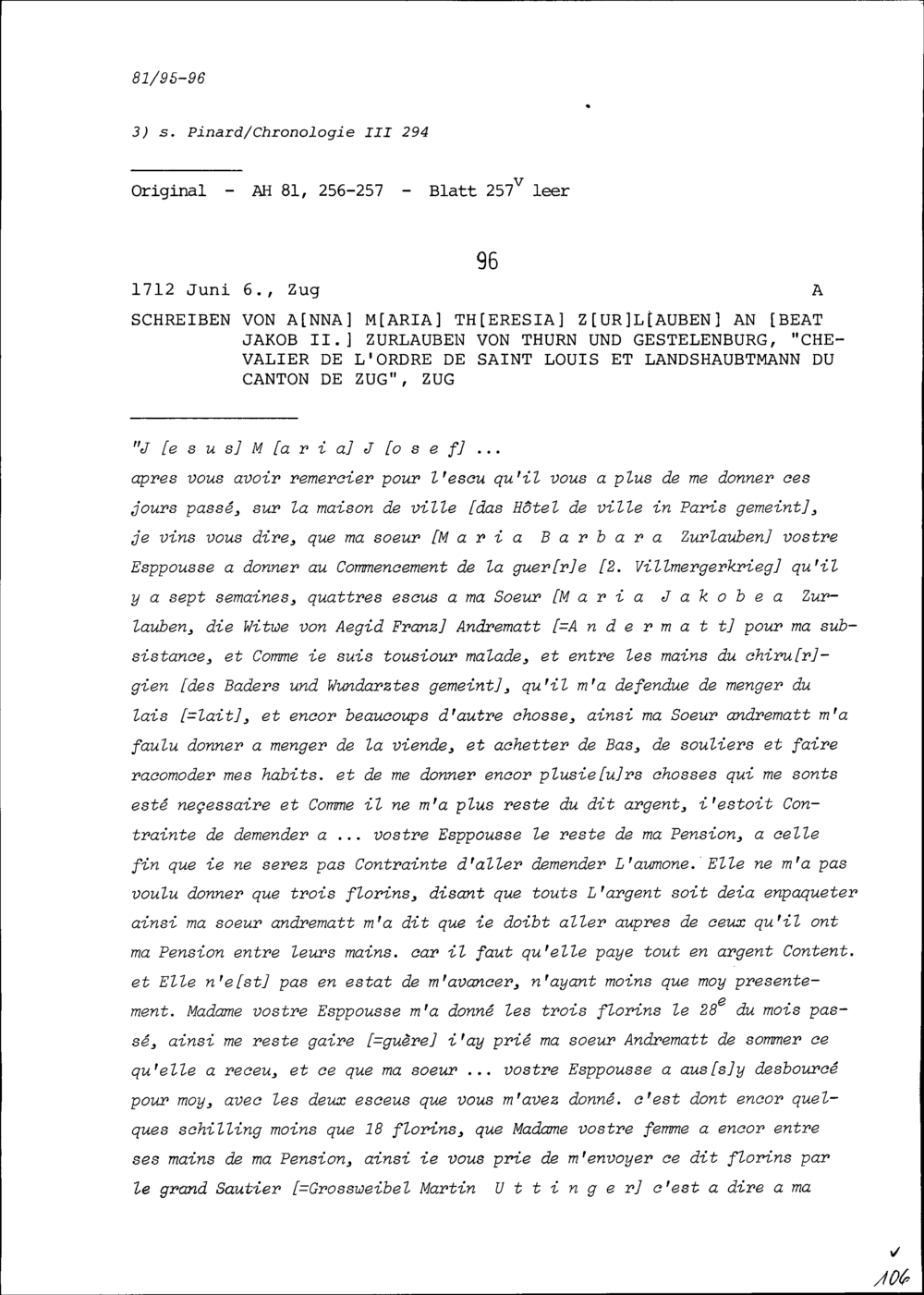 Schreiben von Anna Maria Theresia Zurlauben an Beat Jakob II. Zurlauben, Landshauptmann, Zug