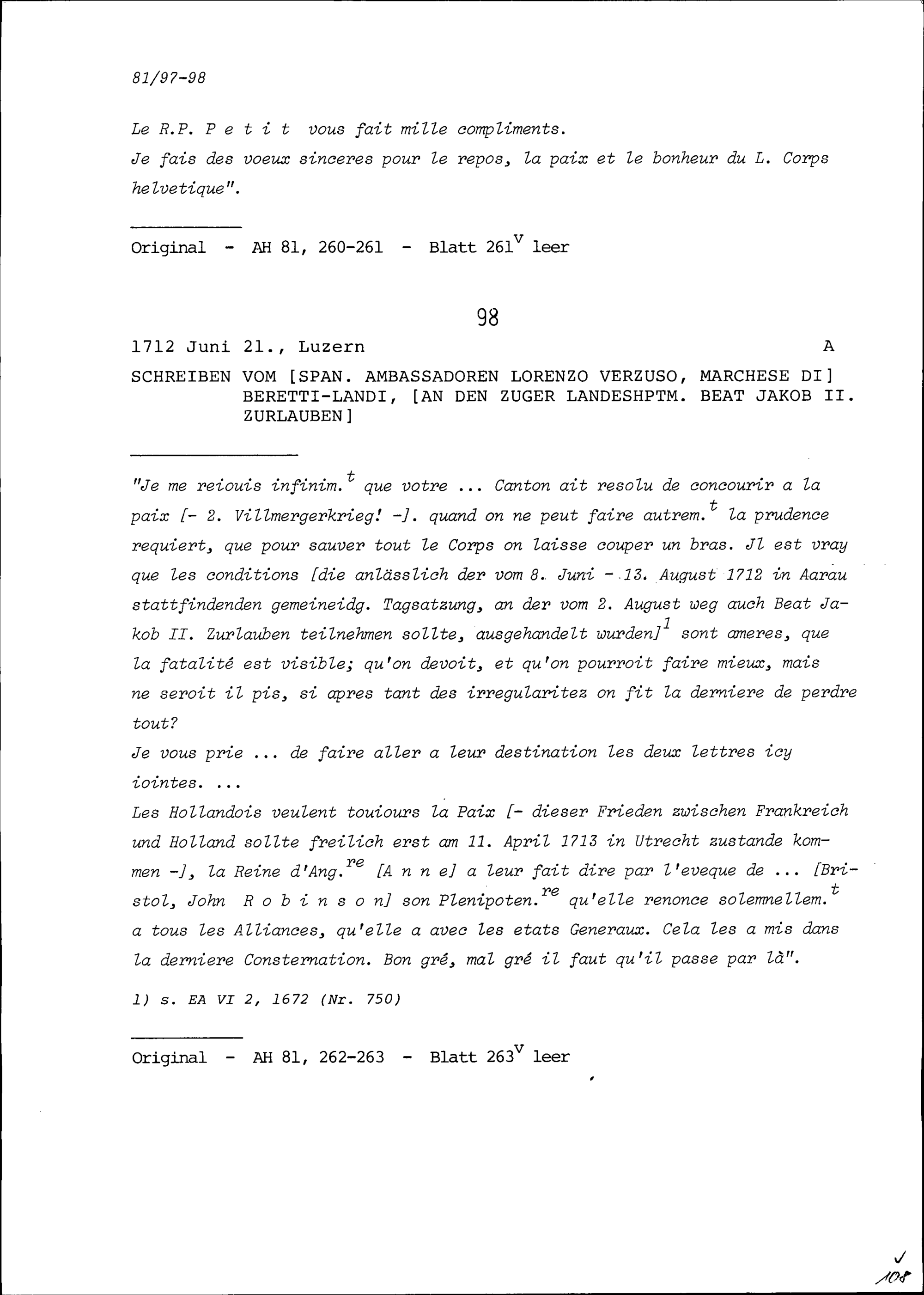 Schreiben von Lorenzo Verzuso, Marchese di Beretti-Landi, Ambassador von Spanien, an Beat Jakob II. Zurlauben, Zuger Landeshauptmann