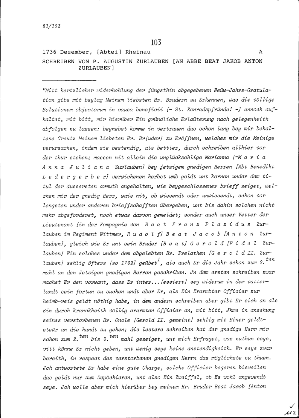 Schreiben von Augustin Zurlauben, Benediktinerpater, an Beat Jakob Anton Zurlauben, Priester
