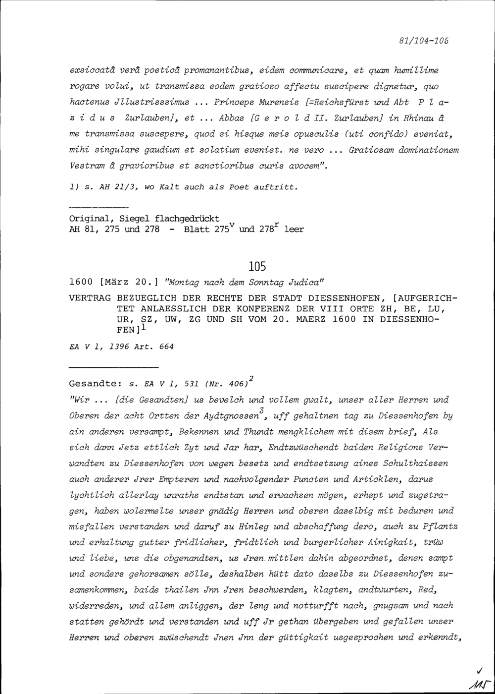 Vertrag betreffend Rechte der Stadt Diessenhofen, beschlossen an der Konferenz der Acht Orte Zürich, Bern, Luzern, Uri, Schwyz, Unterwalden (Ob- und Nidwalden), Zug und Schaffhausen vom 20. März 1600 in Diessenhofen