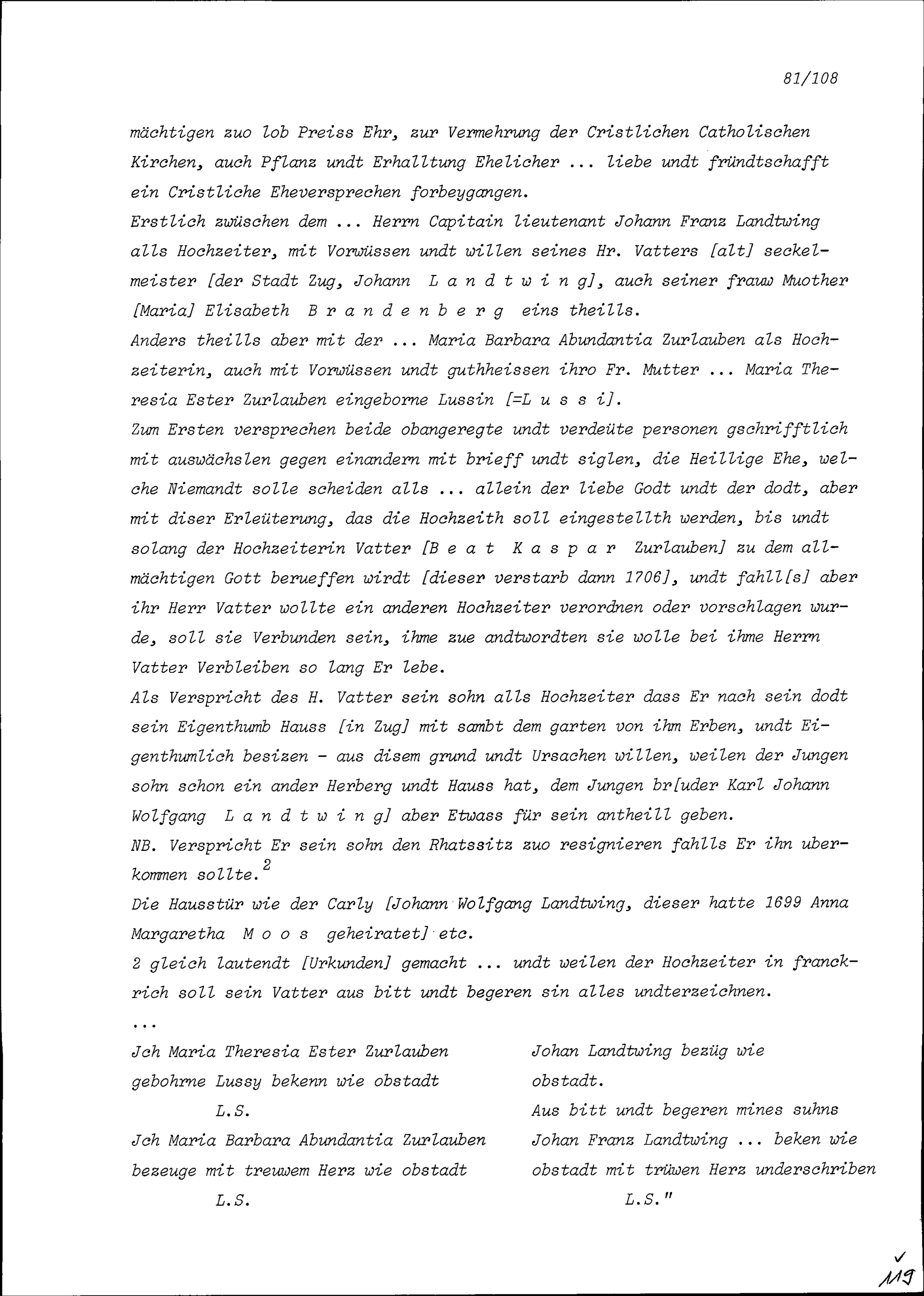 Ehebrief zwischen Johann Franz Landtwing und Maria Barbara Abundantia Zurlauben