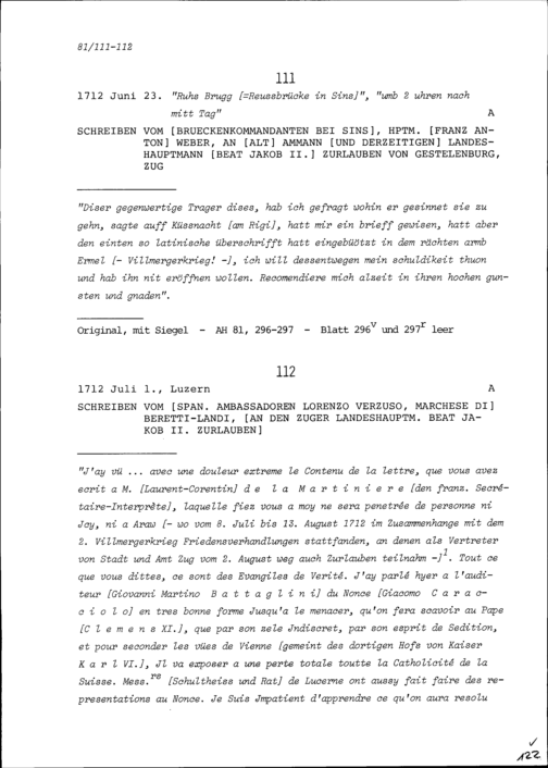 Schreiben von Franz Anton Weber, Brückenkommandant bei Sins und Hauptmann, an Beat...