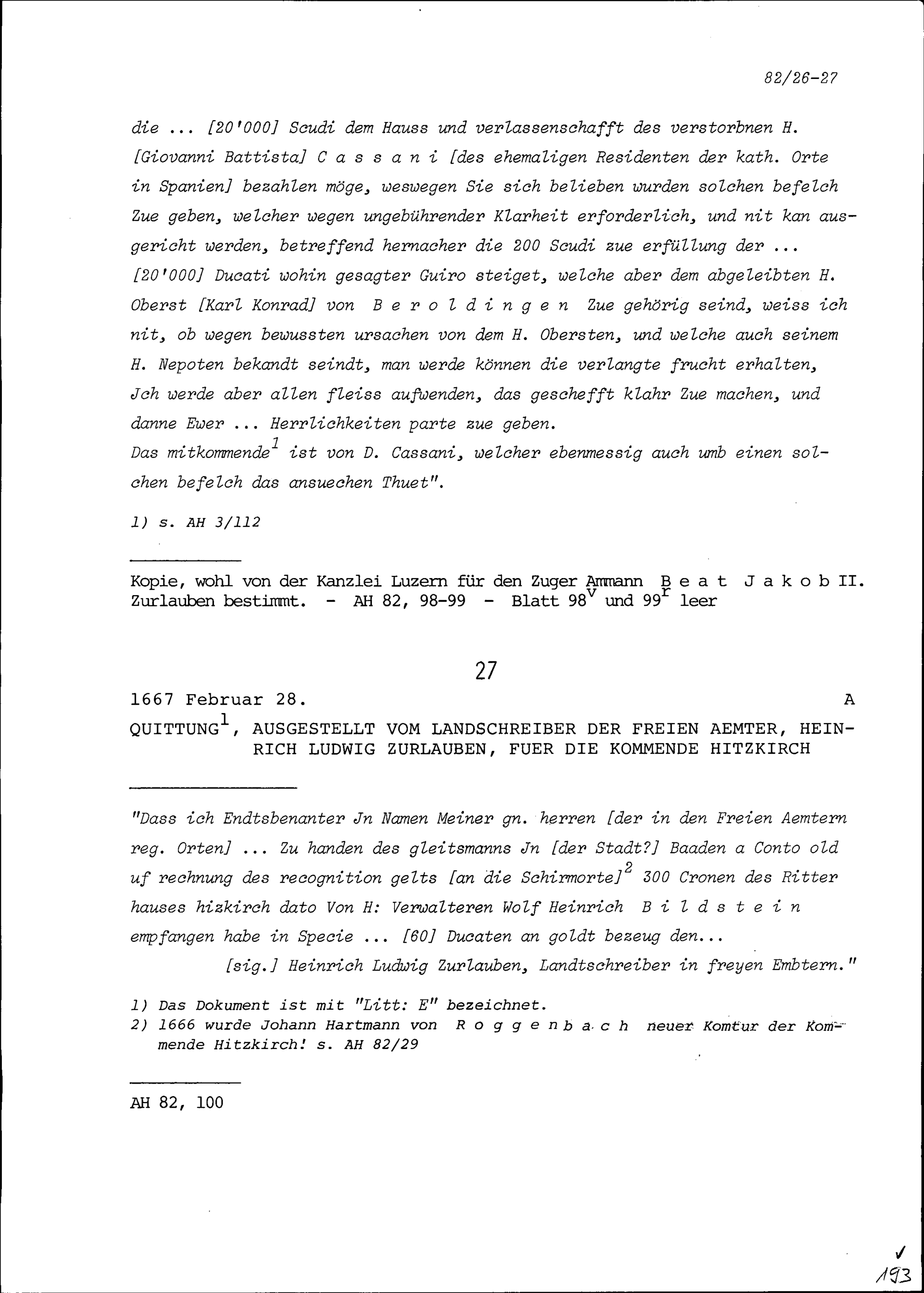 Quittung für die Kommende Hitzkirch, ausgestellt von Heinrich Ludwig Zurlauben, Landschreiber...