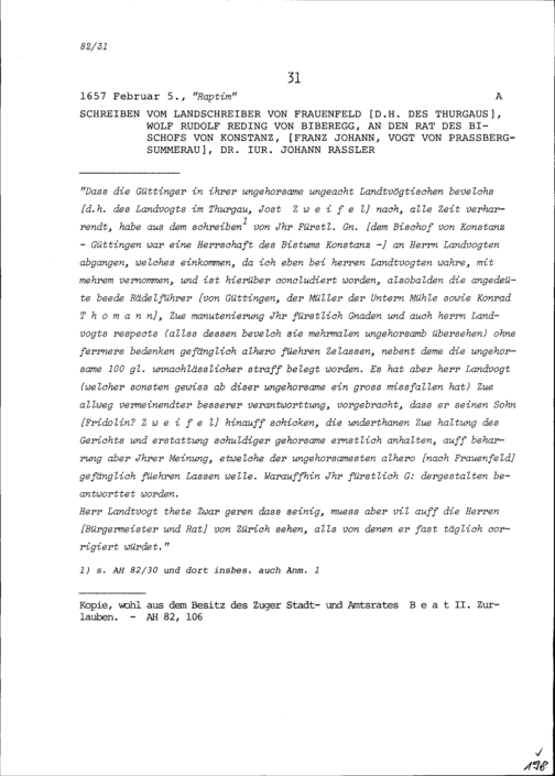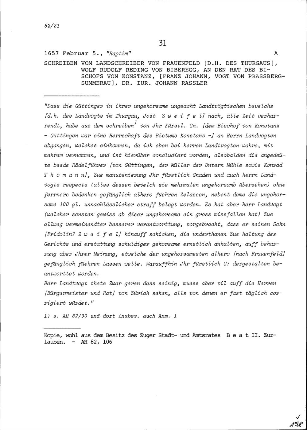 Schreiben von Wolf Rudolf Reding von Biberegg, Landschreiber des Thurgaus, in Frauenfeld, an Johann Rassler, Dr. iur. und Rat von Franz Johann Vogt von Prassberg-Summerau, Bischofs von Konstanz wegen ungehorsamen Güttingern