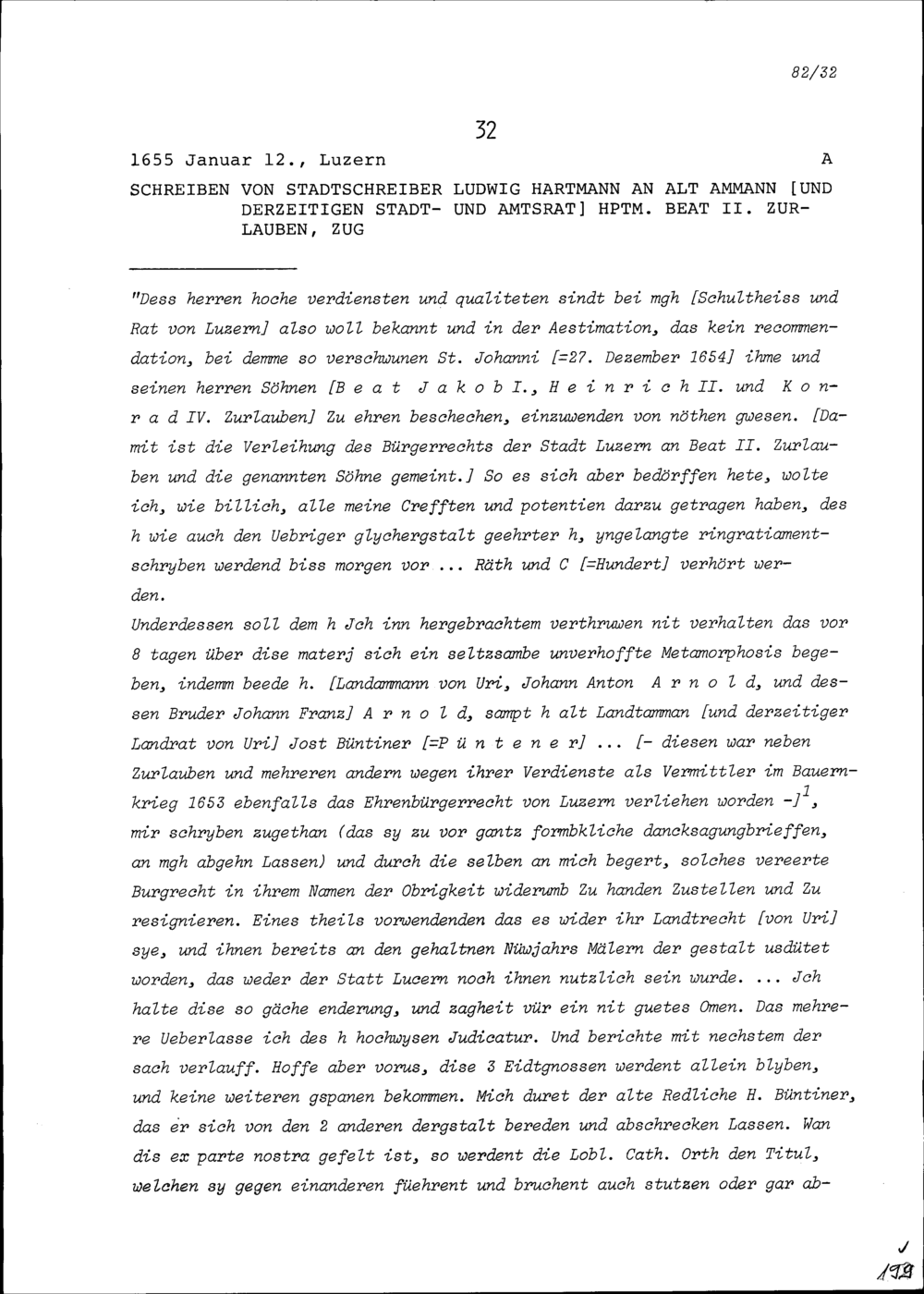 Schreiben von Ludwig Hartmann, Stadtschreiber, an Beat II. Zurlauben, Hauptmann und Stadt- und Amtrat, Zug