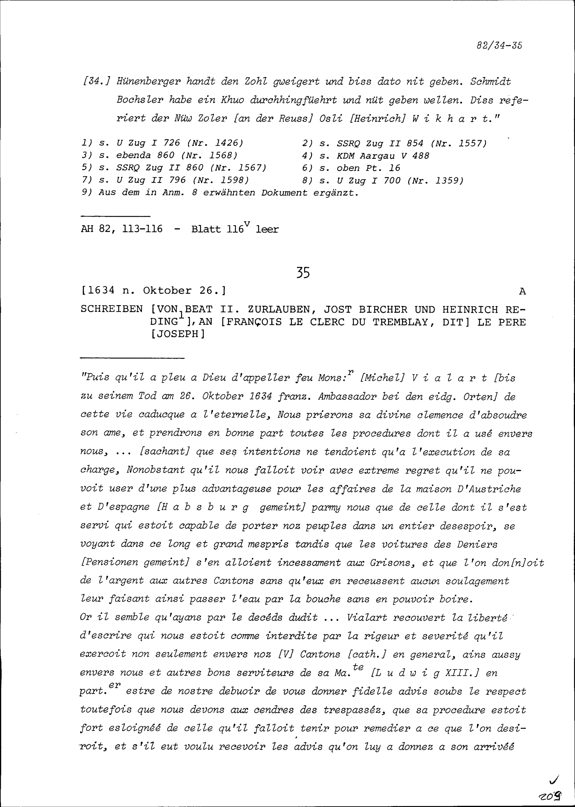 Schreiben von Beat II. Zurlauben, von Jost Bircher und von Heinrich Reding an François Le Clerc de Tremblay, genannt Le Père Joseph