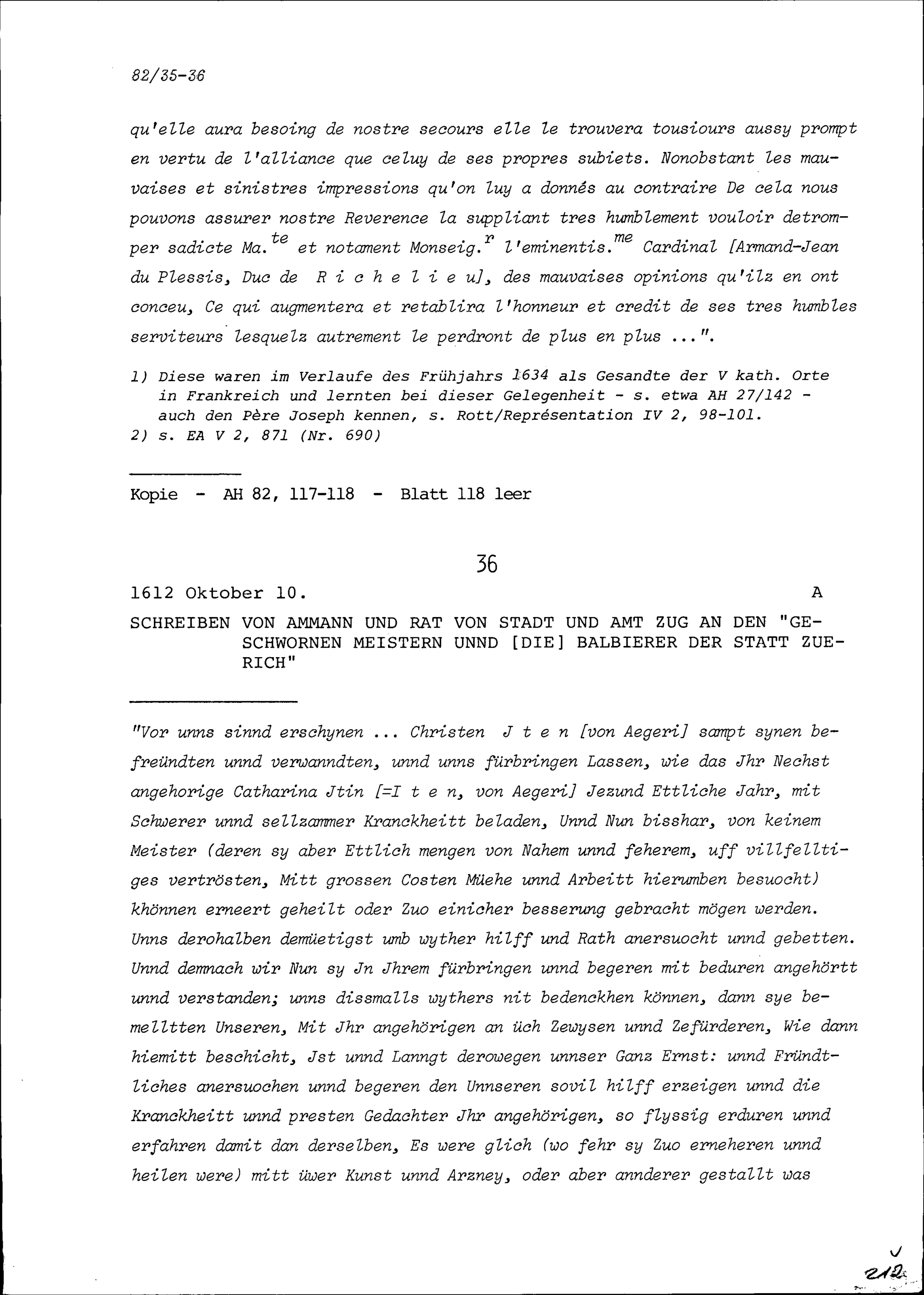 Schreiben des Ammanns und Rats von Stadt und Amt Zug an Meister und Balbierer der...