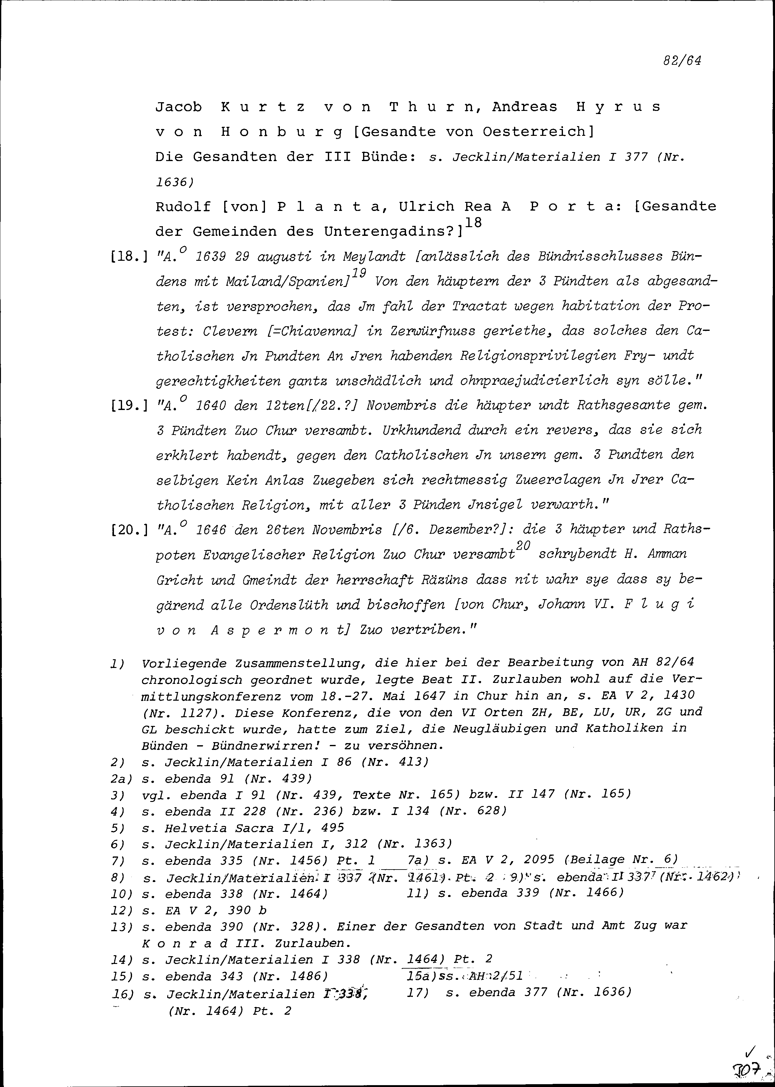 Zusammenstellung von Fakten bezüglich des Verhältnisses zwischen den Neugläubigen und den Katholiken in Bünden, insbesondere zwischen den Erstern und den Bischöfen von Chur, aufgezeichnet von Beat II. Zurlauben, Tagsatzungsgesandter von Stadt und Amt Zug