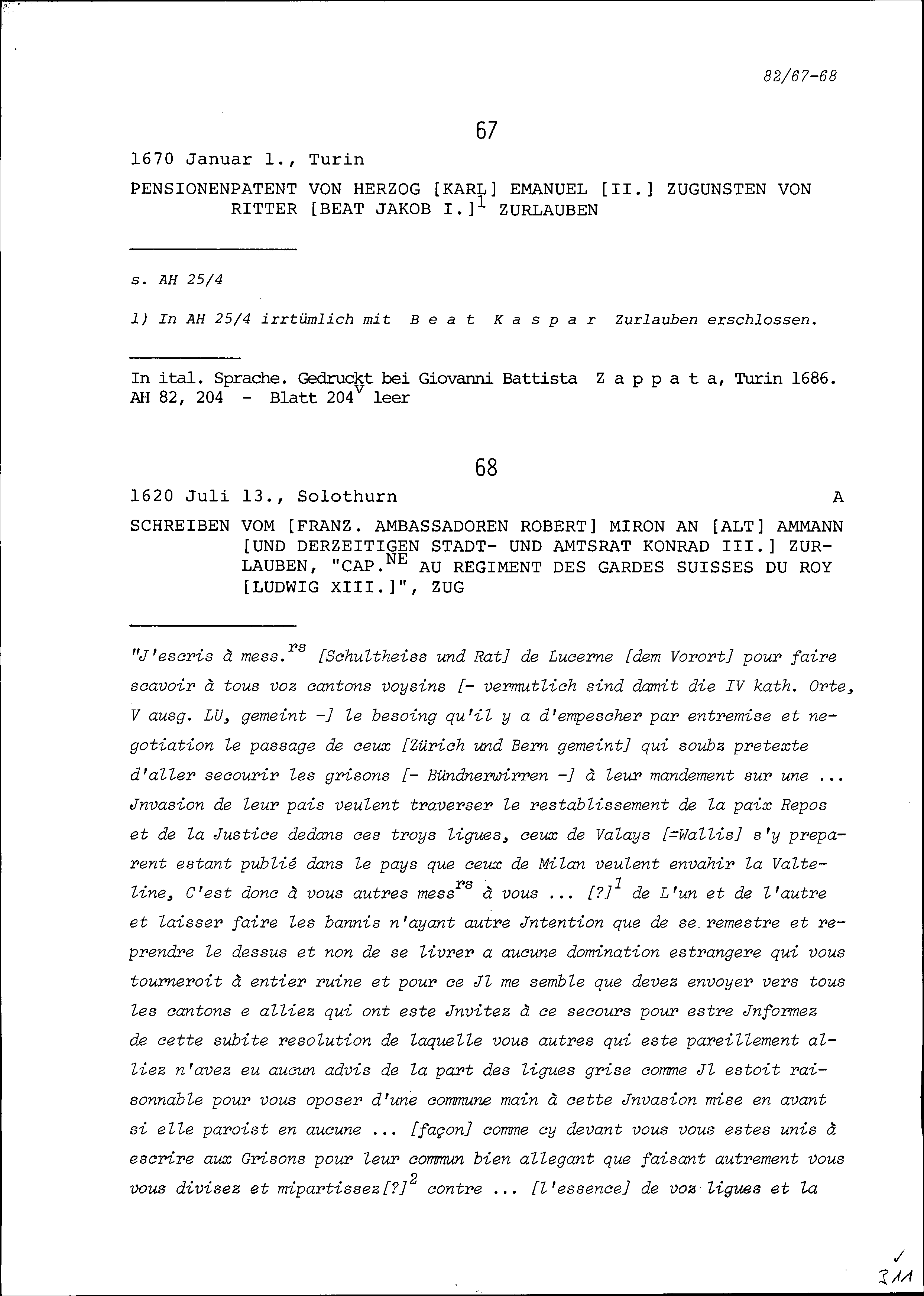 Druck: Pensionenpatent von Karl Emanuel II., Herzog von Savoyen, zugunsten von Beat Jakob I. Zurlauben