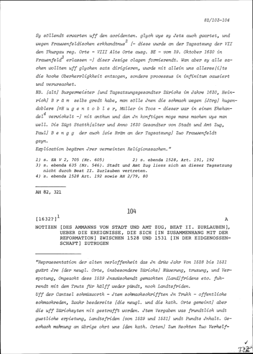 Notiz von Beat II. Zurlauben, Ammann von Stadt und Amt Zug, zur Reformation zwischen 1528 und 1531 in der Eidgenossenschaft