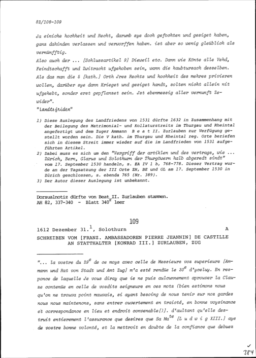 Schreiben von Pierre Jeannin de Castille, Ambassador von Frankreich, an Konrad III. Zurlauben, Statthalter, Zug