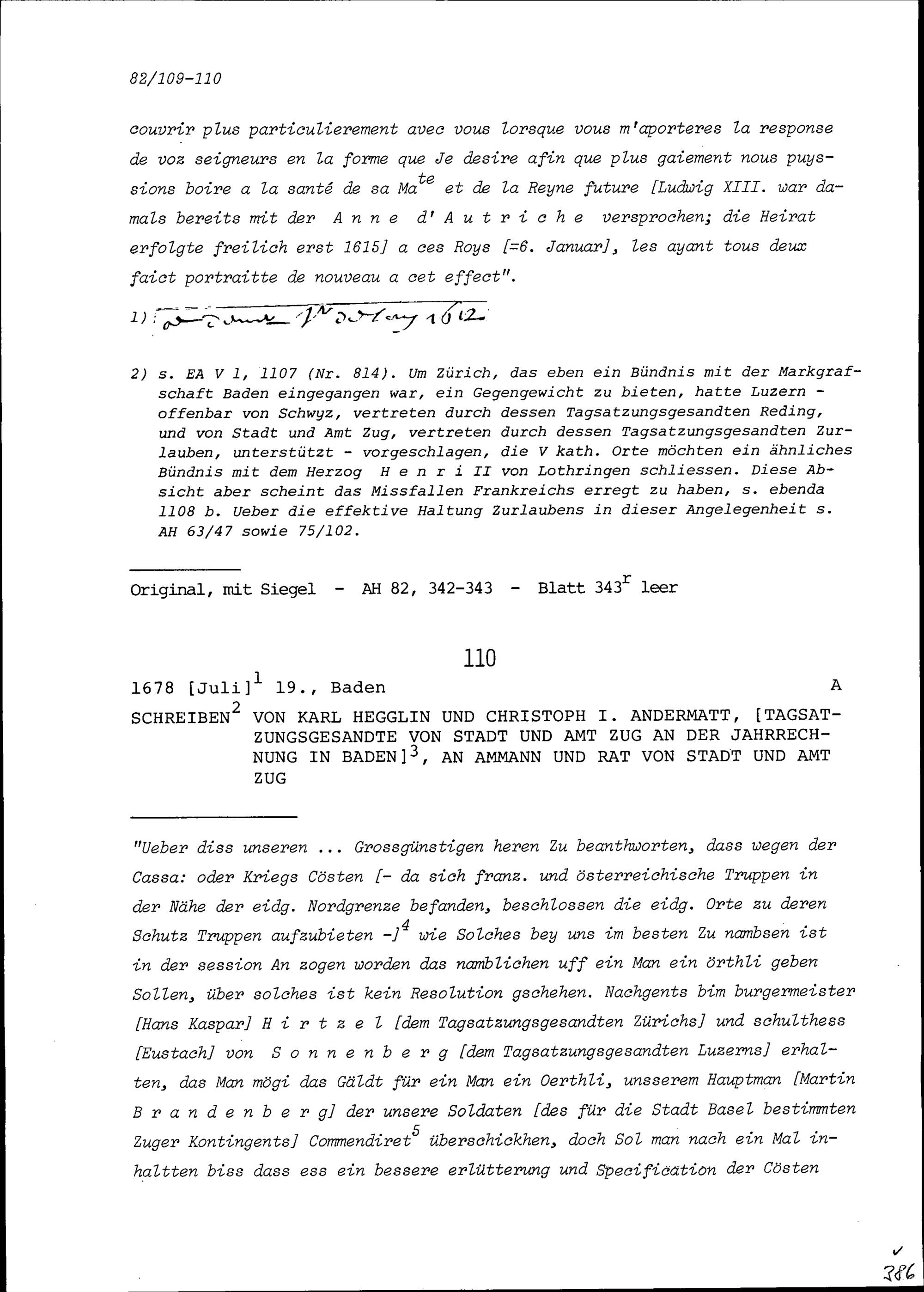 Schreiben von Karl Hegglin und Christoph I. Andermatt, Tagsatzungsgesandte von Stadt und Amt Zug, an Ammann und Rat von Stadt und Amt Zug