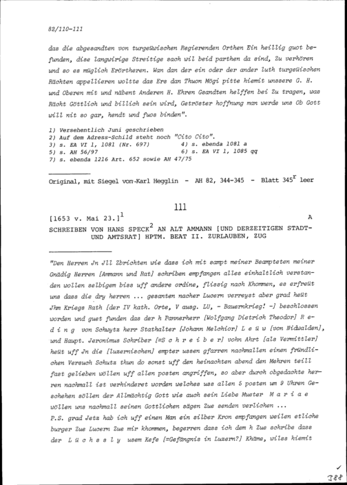 Schreiben von Hans Speck an Beat II. Zurlauben, Hauptmann und Stadt- und Amtrat, Zug