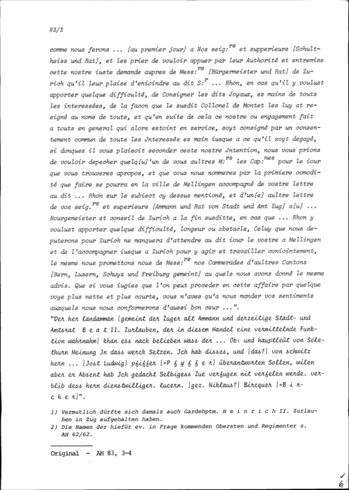 Schreiben der Obersten und Hauptleute in Solothurn an Heinrich II. Zurlauben, Gardehauptmann