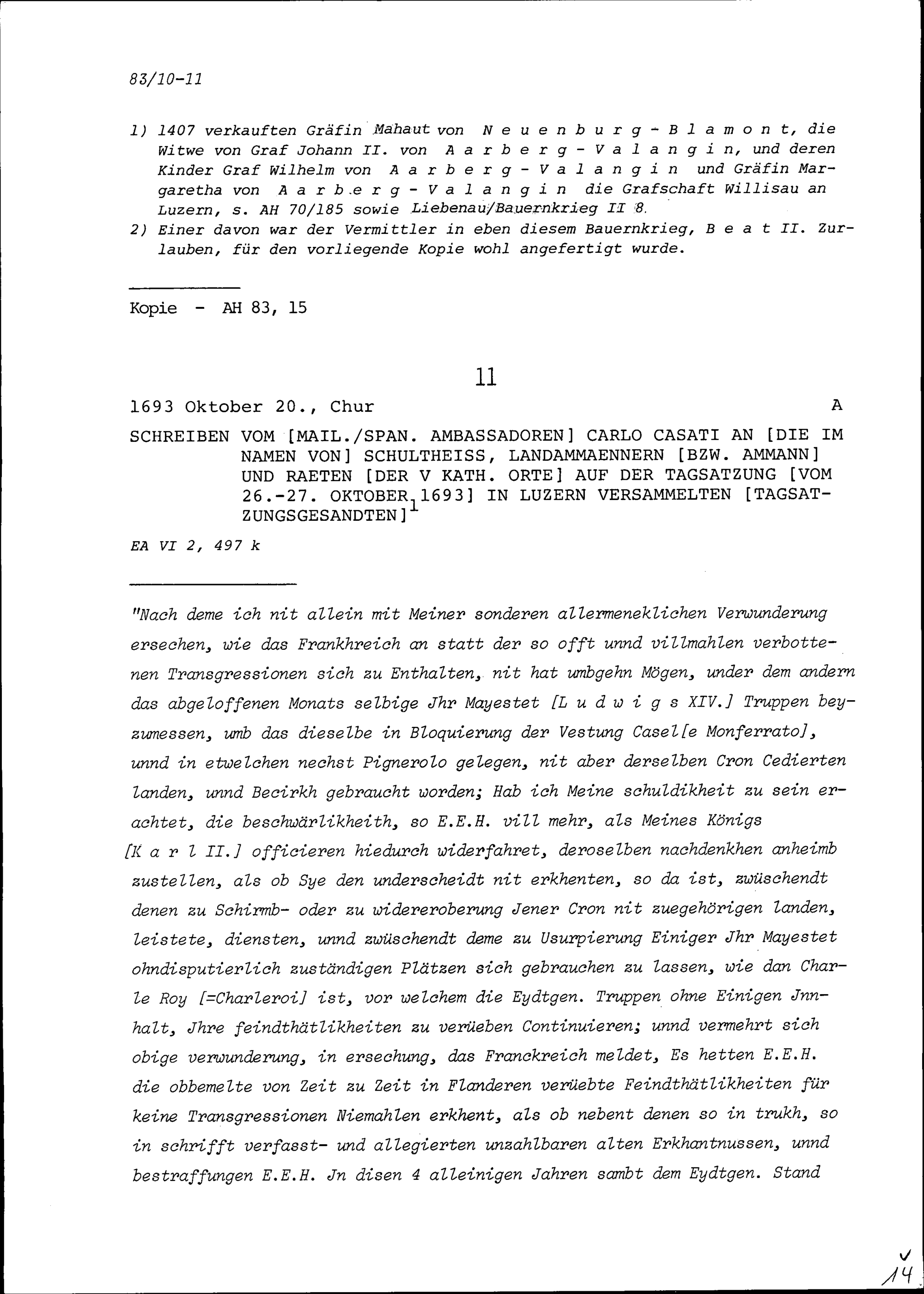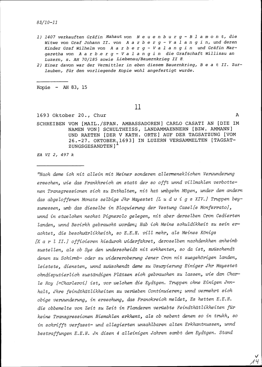 Schreiben von Karl Casati, Ambassador von Mailand-Spanien, an die Tagsatzungsgesandten der Fünf Katholischen Orte auf der Tagsatzung vom 26. bis 27. Oktober 1693 in Luzern