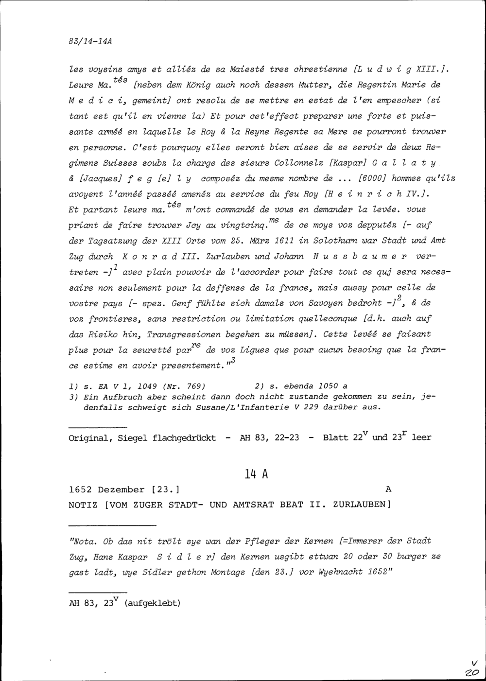 Notiz von Beat II. Zurlauben, Stadt- und Amtrat Zug