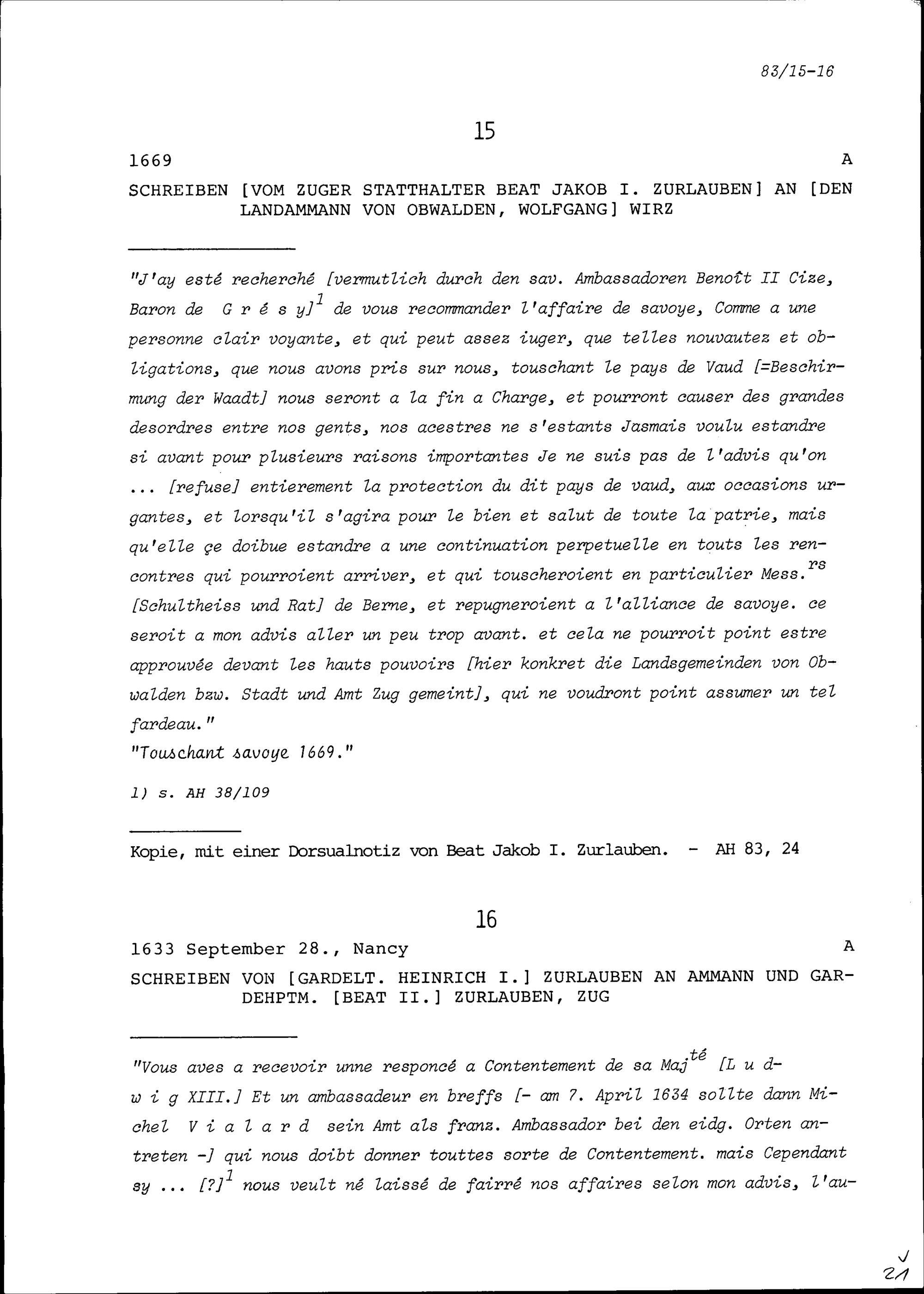 Schreiben von Beat Jakob I. Zurlauben, Statthalter Zug, an Wolfgang Wirz, Landammann...