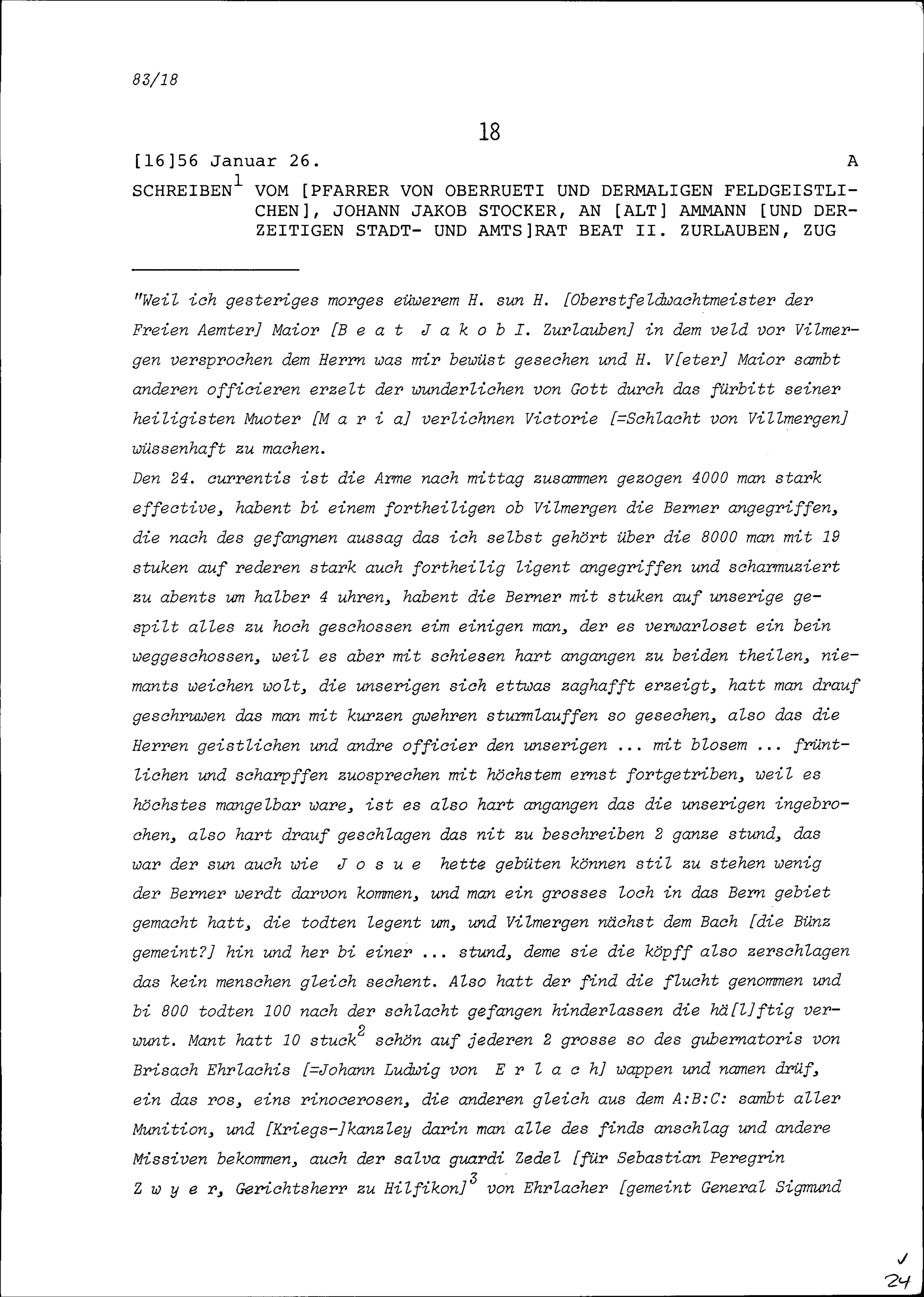 Schreiben von Johann Jakob Stocker, Pfarrer von Oberrüti und Feldgeistlicher, an Beat II. Zurlauben, Altammann und Stadt- und Amtrat, Zug