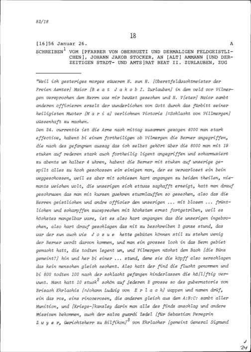 Schreiben von Johann Jakob Stocker, Pfarrer von Oberrüti und Feldgeistlicher, an...