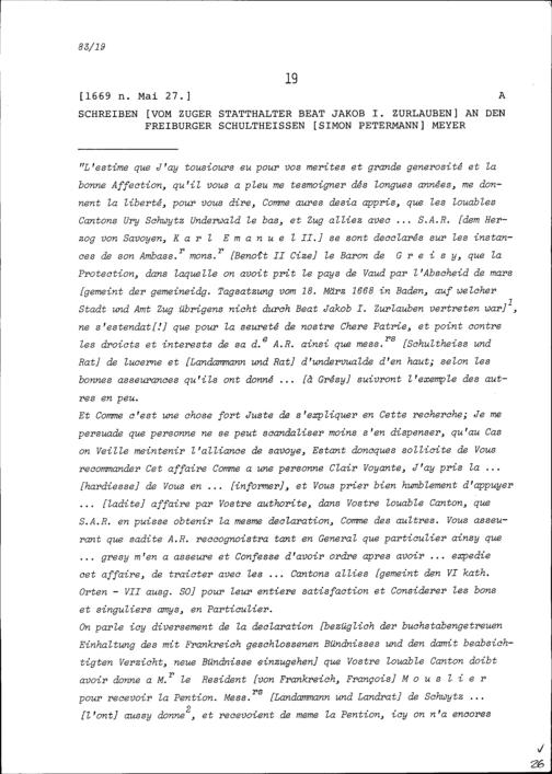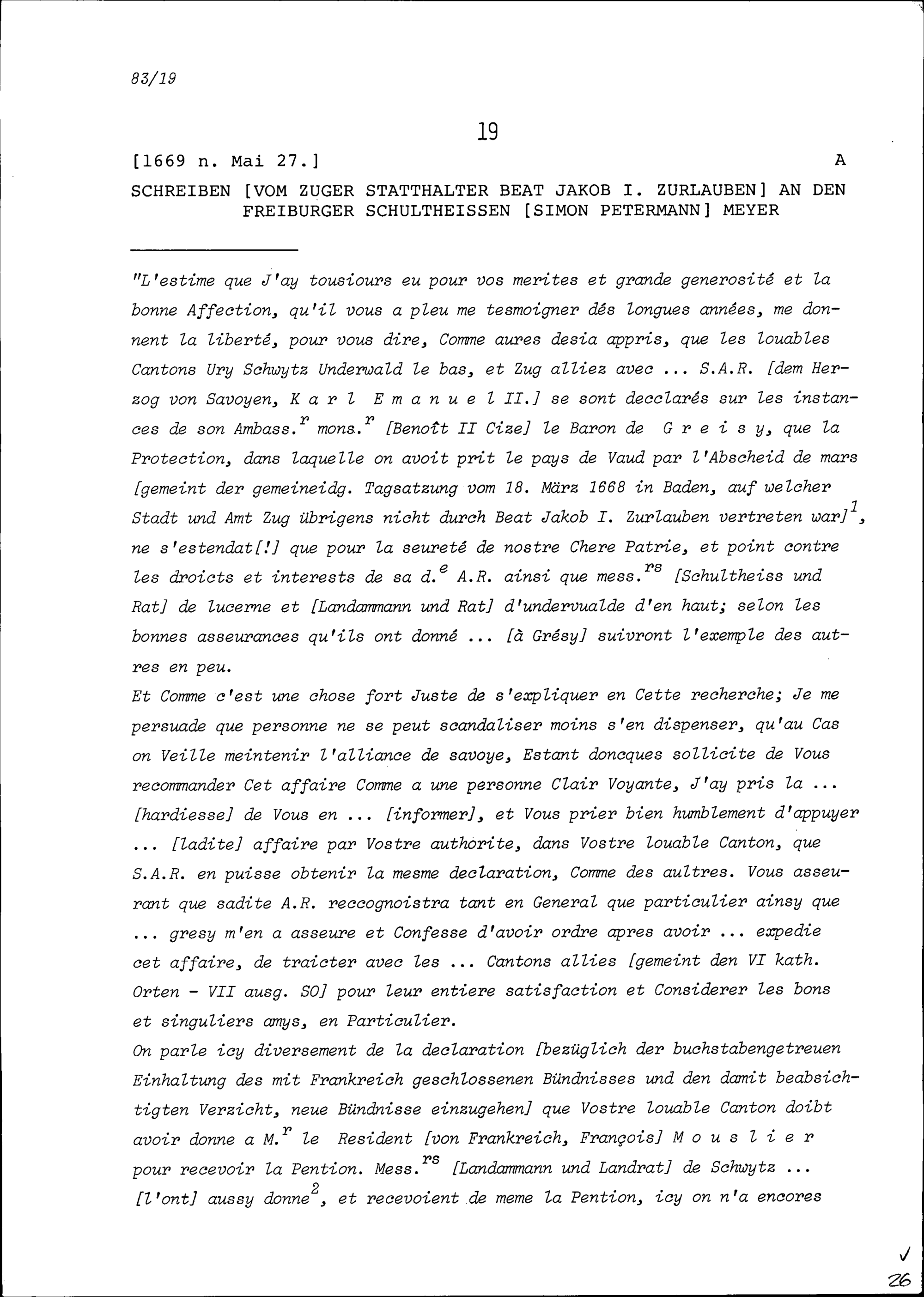 Schreiben von Beat Jakob I. Zurlauben, Statthalter Zug, an Simon Petermann Meyer, Freiburger Schultheissen