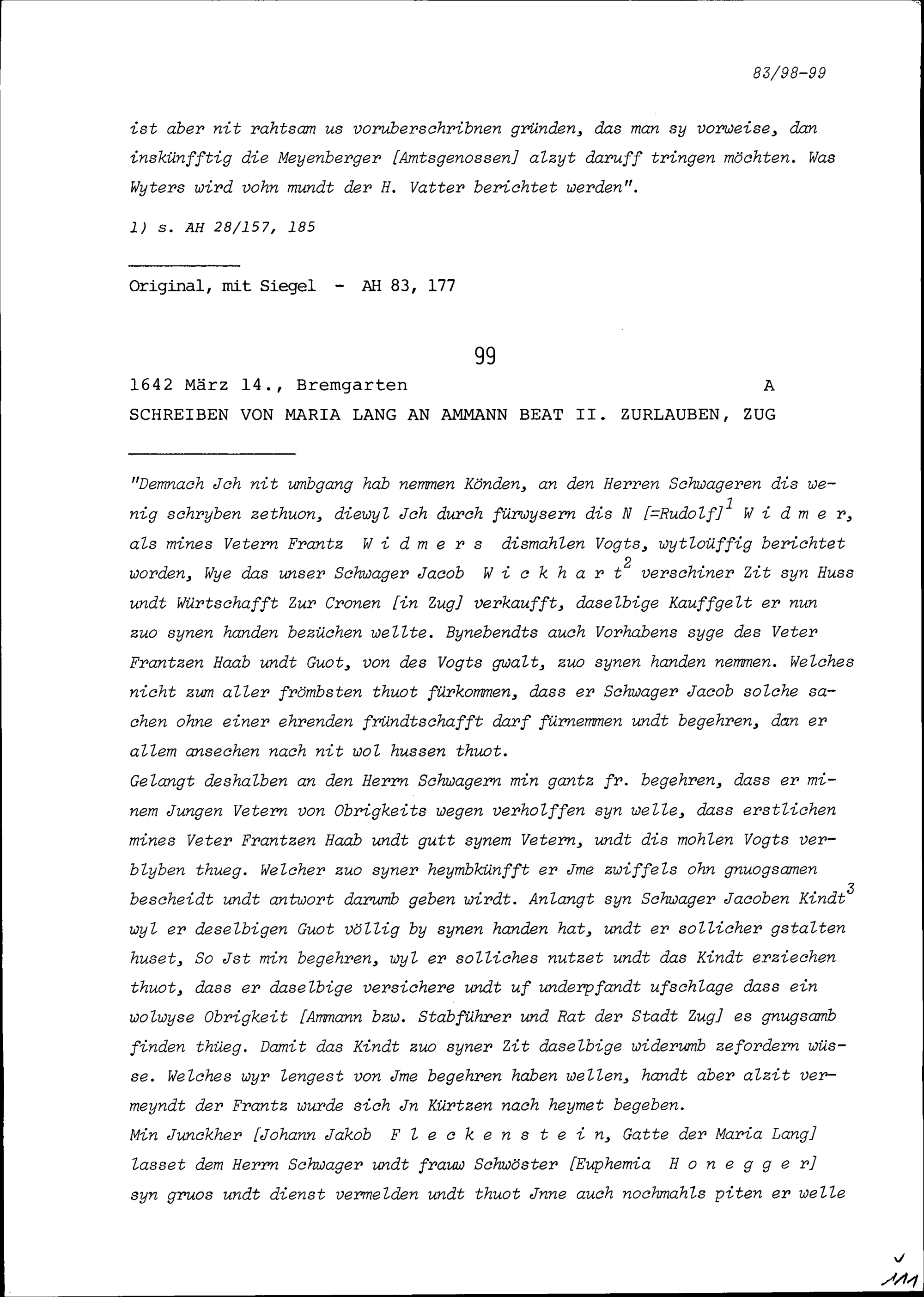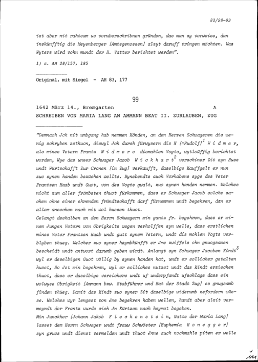 Schreiben von Maria Lang an Beat II. Zurlauben, Ammann, Zug