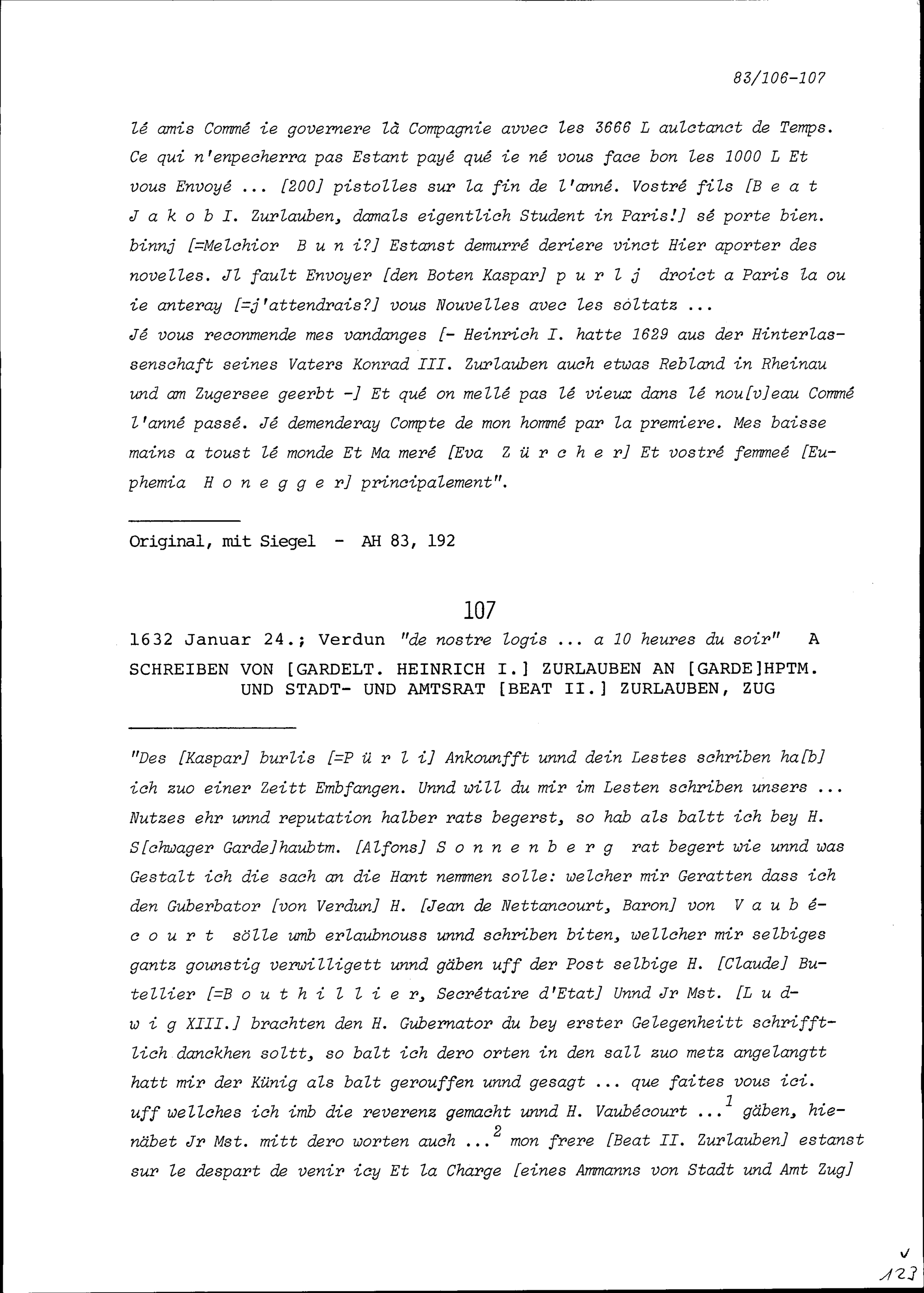 Schreiben von Heinrich I. Zurlauben, Gardeleutnant, an Beat II. Zurlauben, Gardehauptmann...