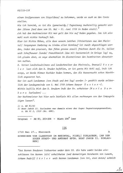 Schreiben von Fidel Zurlauben, Landvogt im Rheintal, an Beat Jakob II. Zurlauben, Stadt- und Amtrat Zug Hauptmann