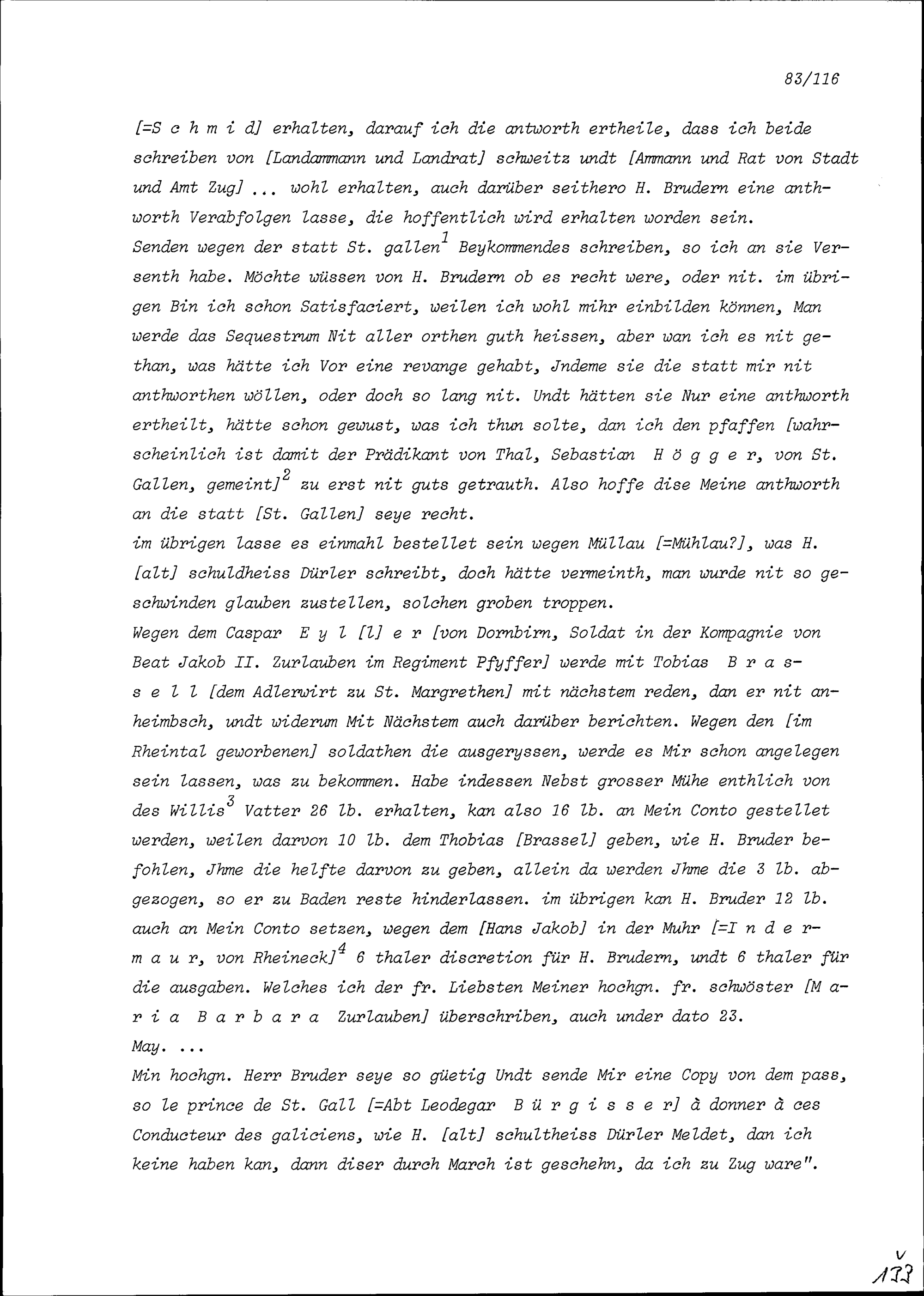 Schreiben von Fidel Zurlauben, Landvogt im Rheintal, an Beat Jakob II. Zurlauben, Stadt- und Amtrat Zug Hauptmann