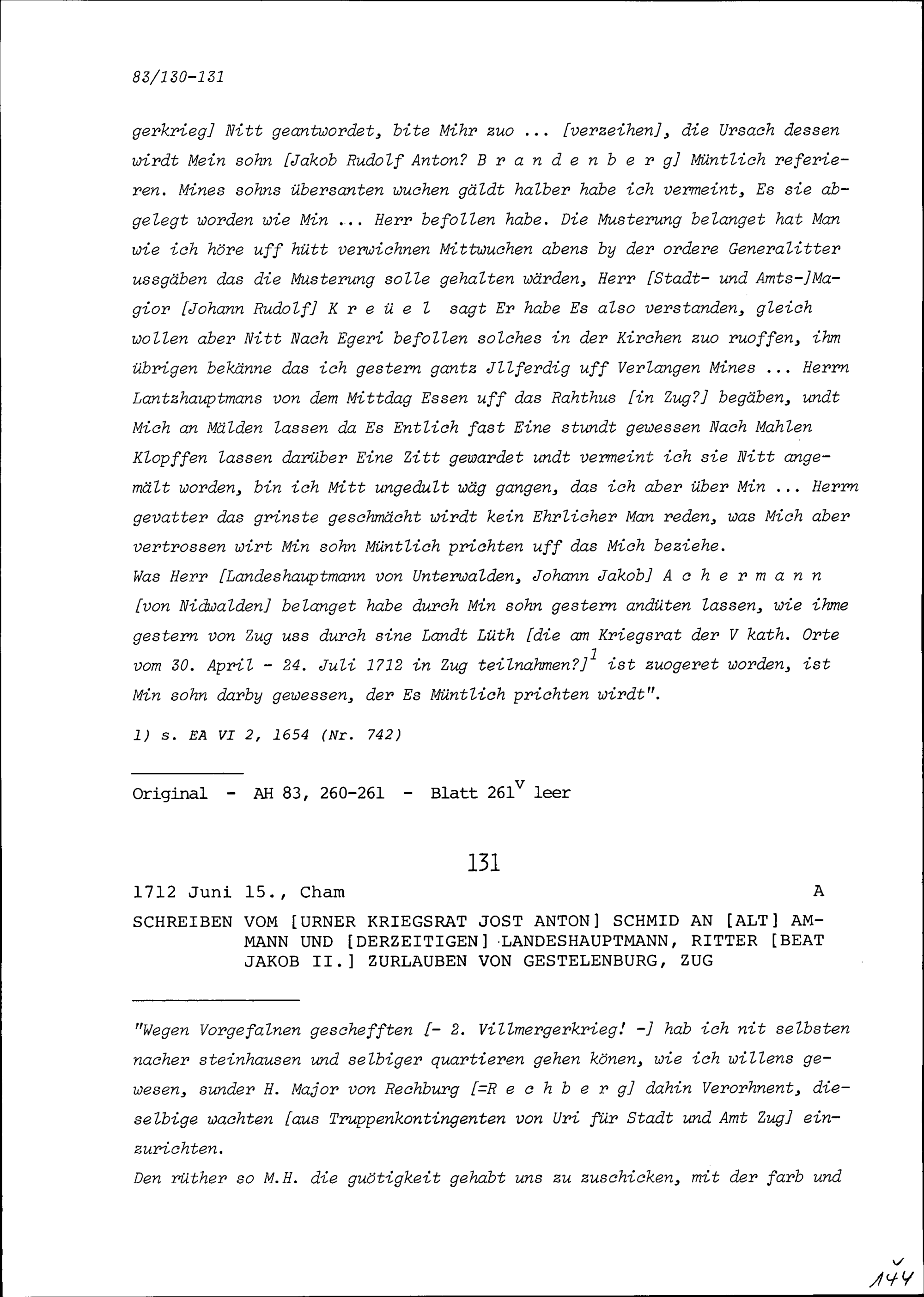 Schreiben von Jost Anton Schmid, Urner Kriegsrat, an Beat Jakob II. Zurlauben, Altammann und Landeshauptmann, Zug