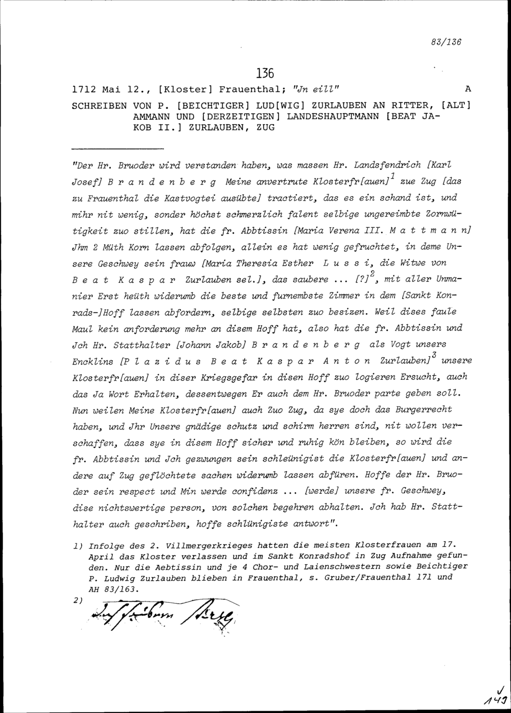 Schreiben von Ludwig Zurlauben, Priester und Beichtiger, an Beat Jakob II. Zurlauben, Altammann und Landeshauptmann, Zug