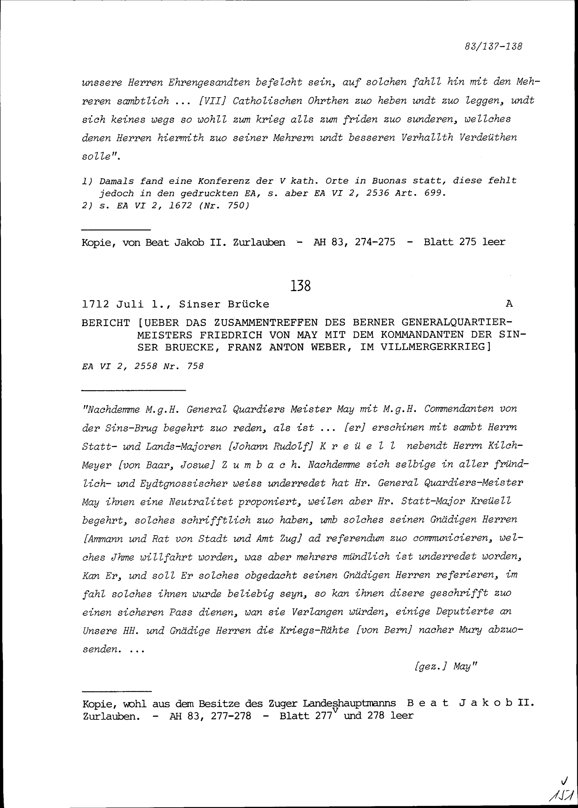 Bericht über das Zusammentreffen von Friedrich von Mai, Berner Generalquartiermeister, mit dem Kommandanten der Sinserbrücke (Reussbrücke), Franz Anton Weber, im Villmergerkrieg