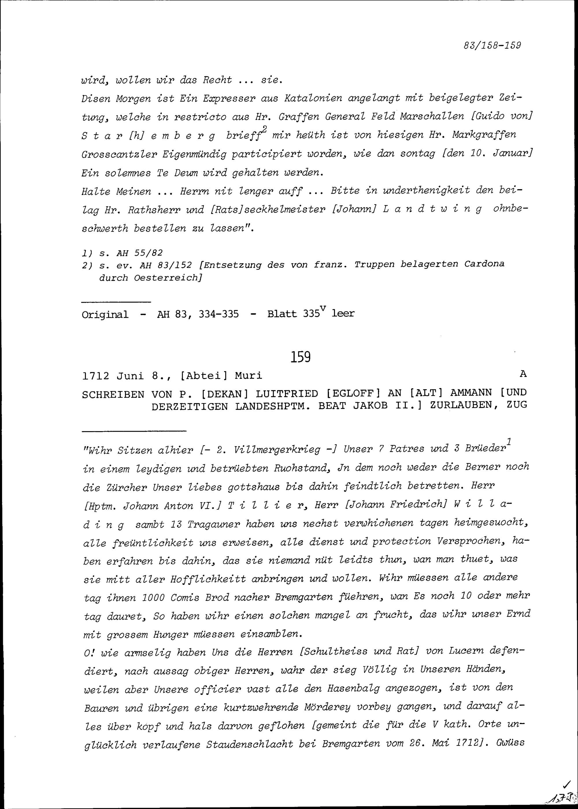 Schreiben von Luitfried Egloff, Priester und Dekan, an Beat Jakob II. Zurlauben, Altammann und Landeshauptmann, Zug