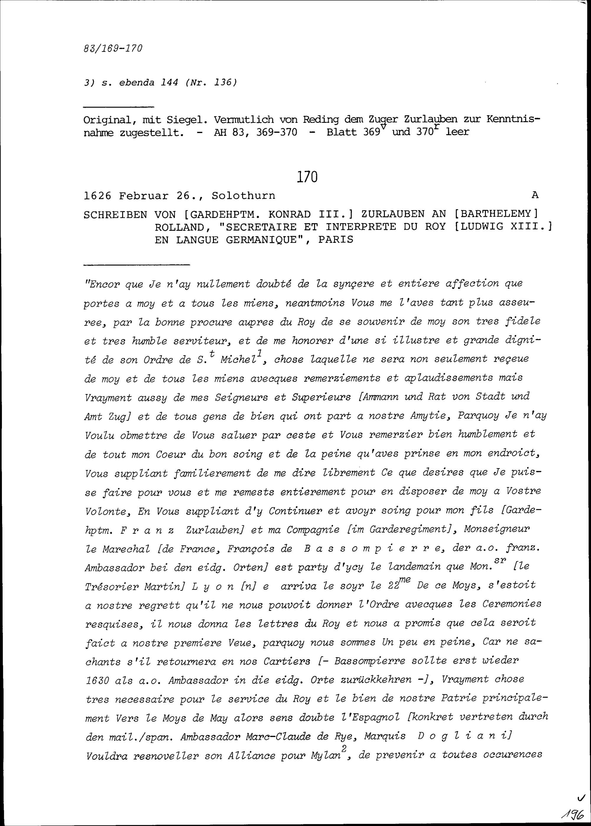 Schreiben von Konrad III. Zurlauben, Gardehauptmann, an Barthélémy Rolland, Dolmetscher von Frankreich, Paris
