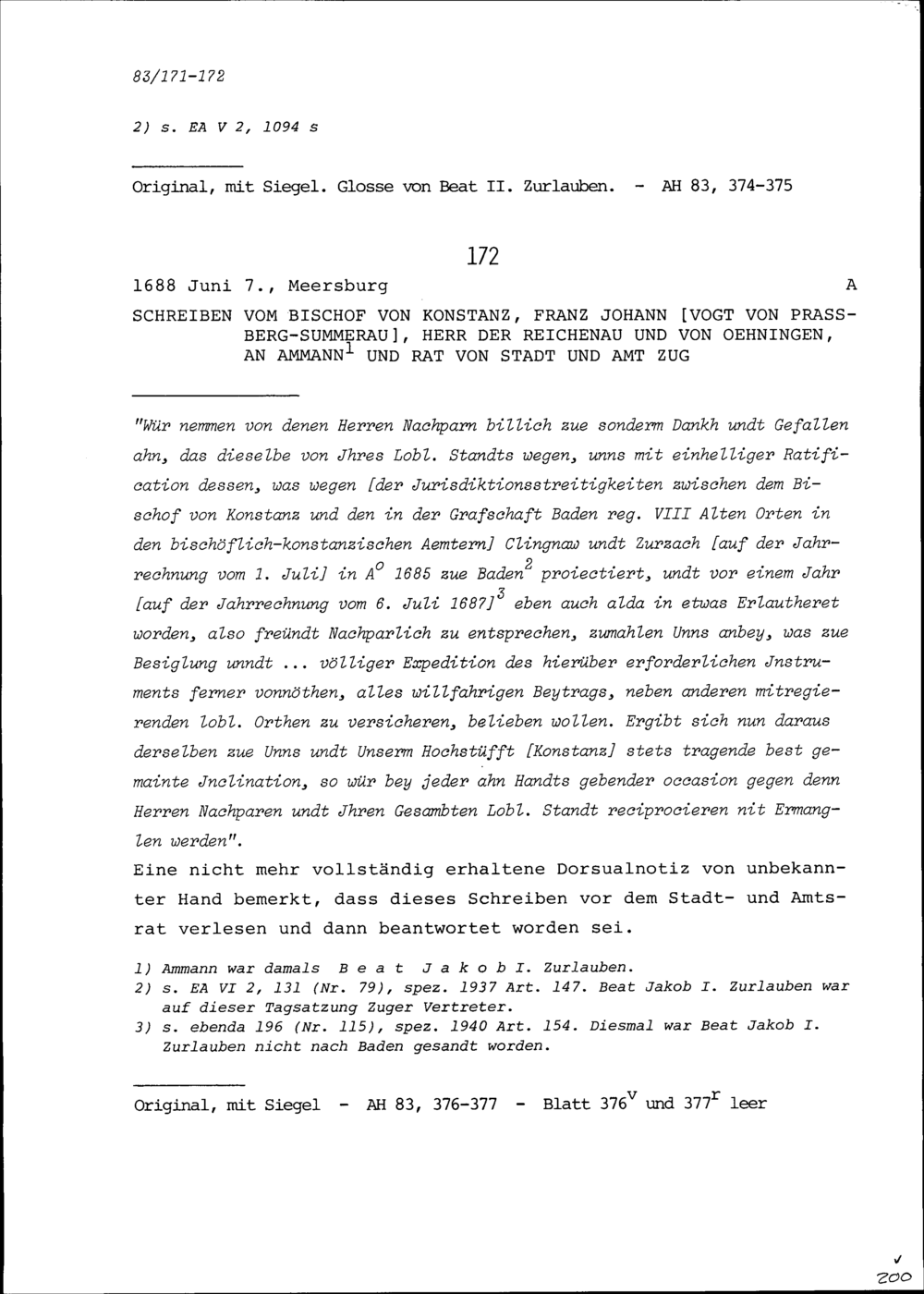 Schreiben von Franz Johann Vogt von Prassberg-Summerau, Bischof von Konstanz und Herr der Reichenau und von Öhningen, an Ammann und Rat von Stadt und Amt Zug