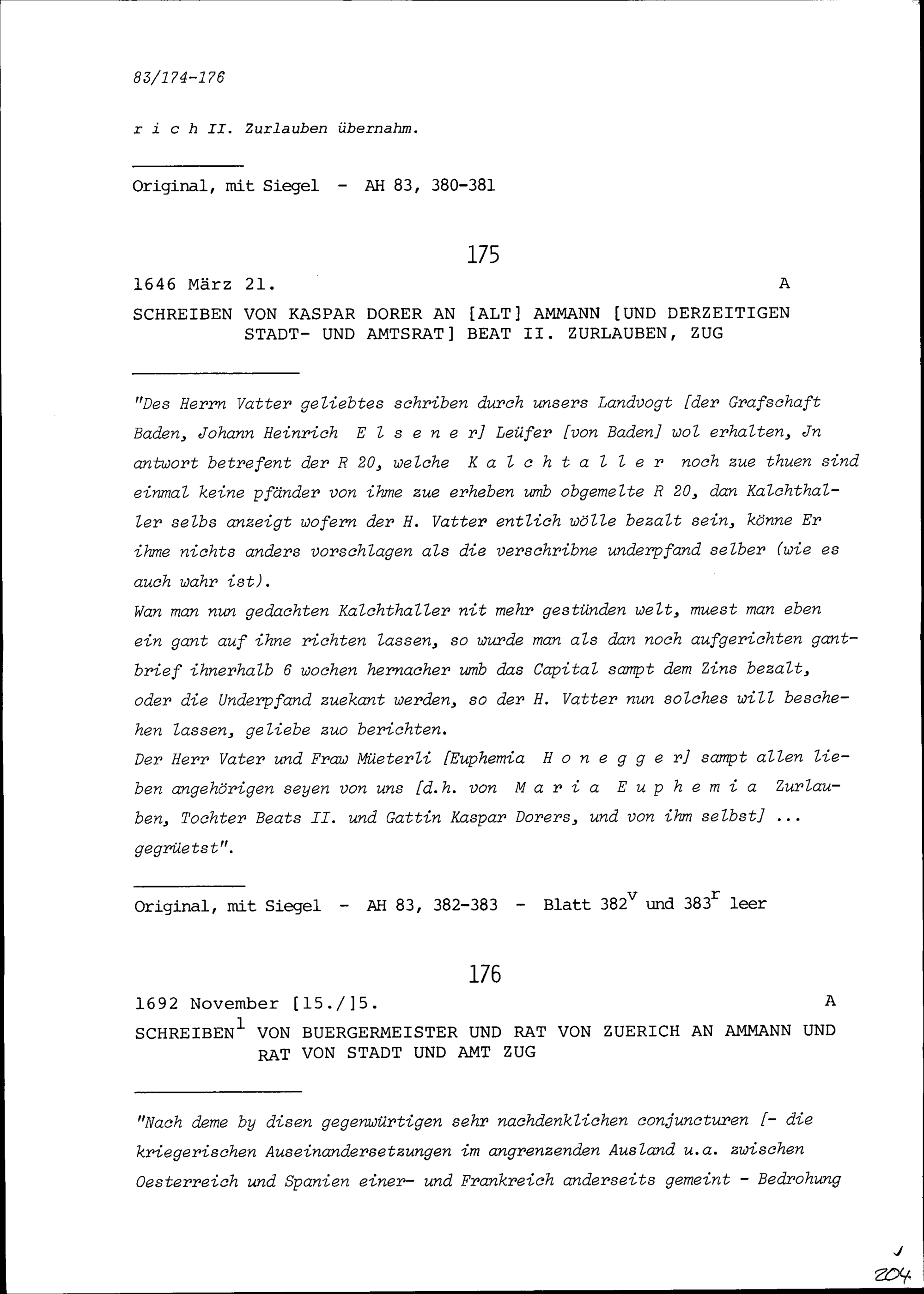 Schreiben von Kaspar Dorer an Beat II. Zurlauben, Altammann und Stadt- und Amtrat, Zug