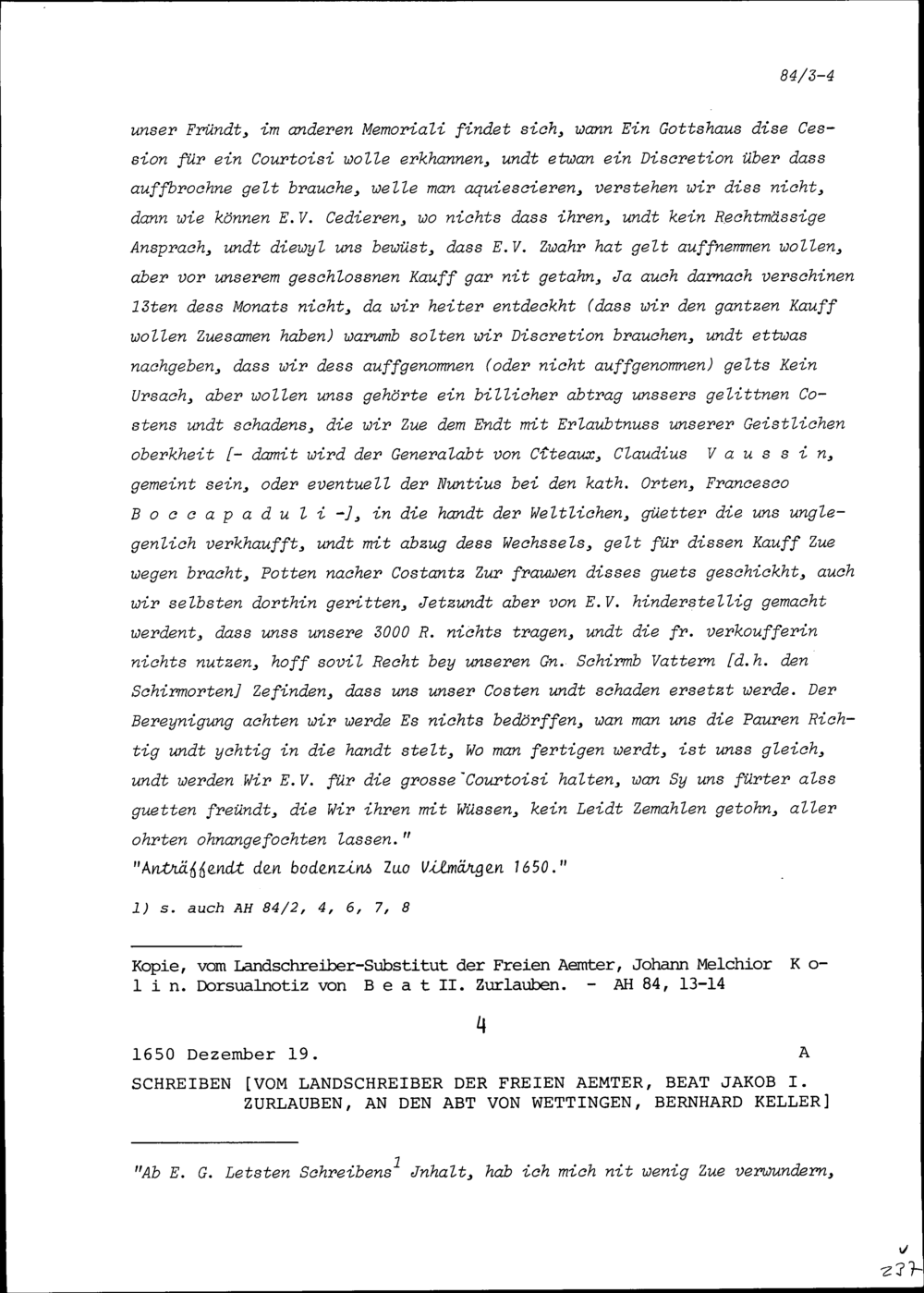 Schreiben von Beat Jakob I. Zurlauben, Landschreiber der Freien Ämter, an Bernhard Keller, Abt von Wettingen
