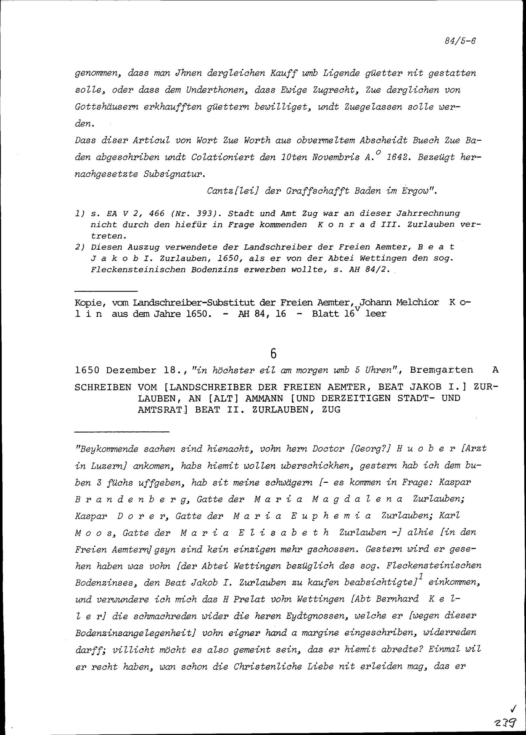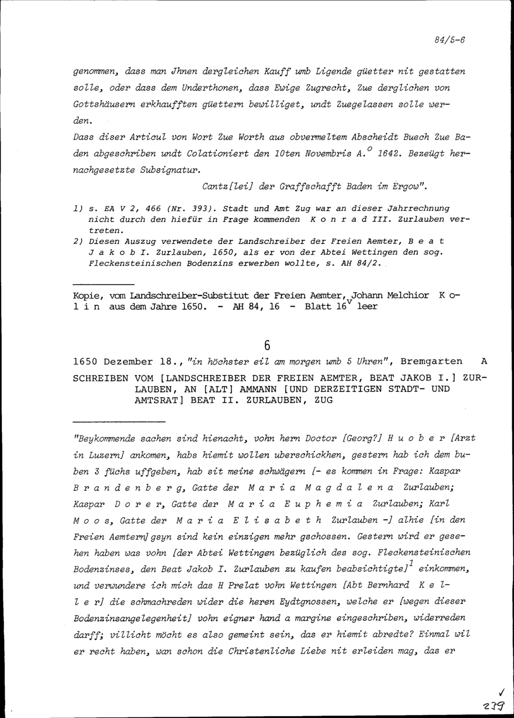 Schreiben von Beat Jakob I. Zurlauben, Landschreiber der Freien Ämter, an Beat II....